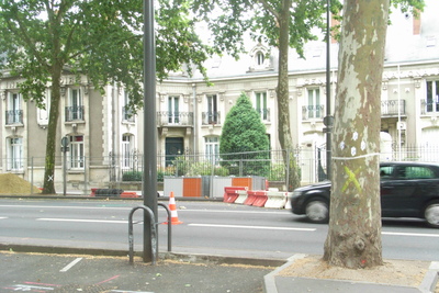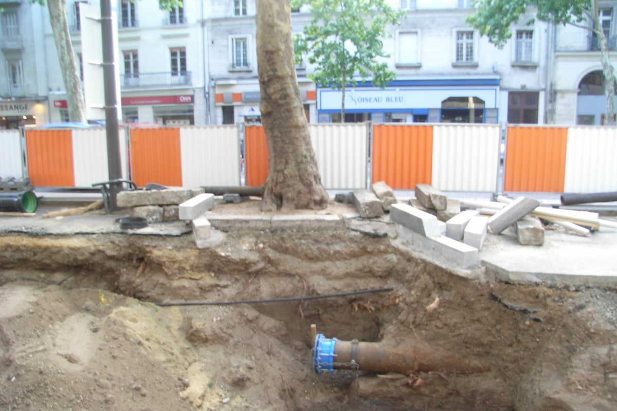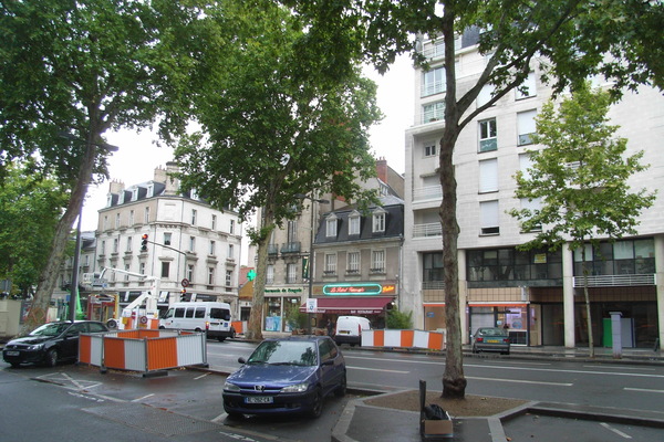 En allant vers Jean Jaurès, nous remarquons que les travaux de dévoiement des réseaux esquintent parfois de très près certains platanes (photo ci-dessus). Alors que pour la plupart des arbres abattus, on ne creusera pas autant si près d'eux. Deux poids, deux mesures. Je rappelle aussi que sur l'avenue Pont Cher, vers Joué lès Tours, le tramway passera sur une artère à deux voies entourée de platanes qui restent en place pour la plupart.. Mais sur l'avenue de Grammont, alors qu'il y a quatre voies, on abat tous ceux bordant ce quatre voies, non seulement sur les stations Jean Jaurès (où la voirie déjà en place intègre les arbres) et Charcot (où la nouvelle voirie aurait pu être disposée légèrement différemment), mais aussi hors station, entre la station Jean Jaurès et la rue Charles Gille. On a l'impression qu'on abat des arbres pour le plaisir sadique de les abattre, la volonté totalitaire se diminuer cette part de nature trop encombrante...