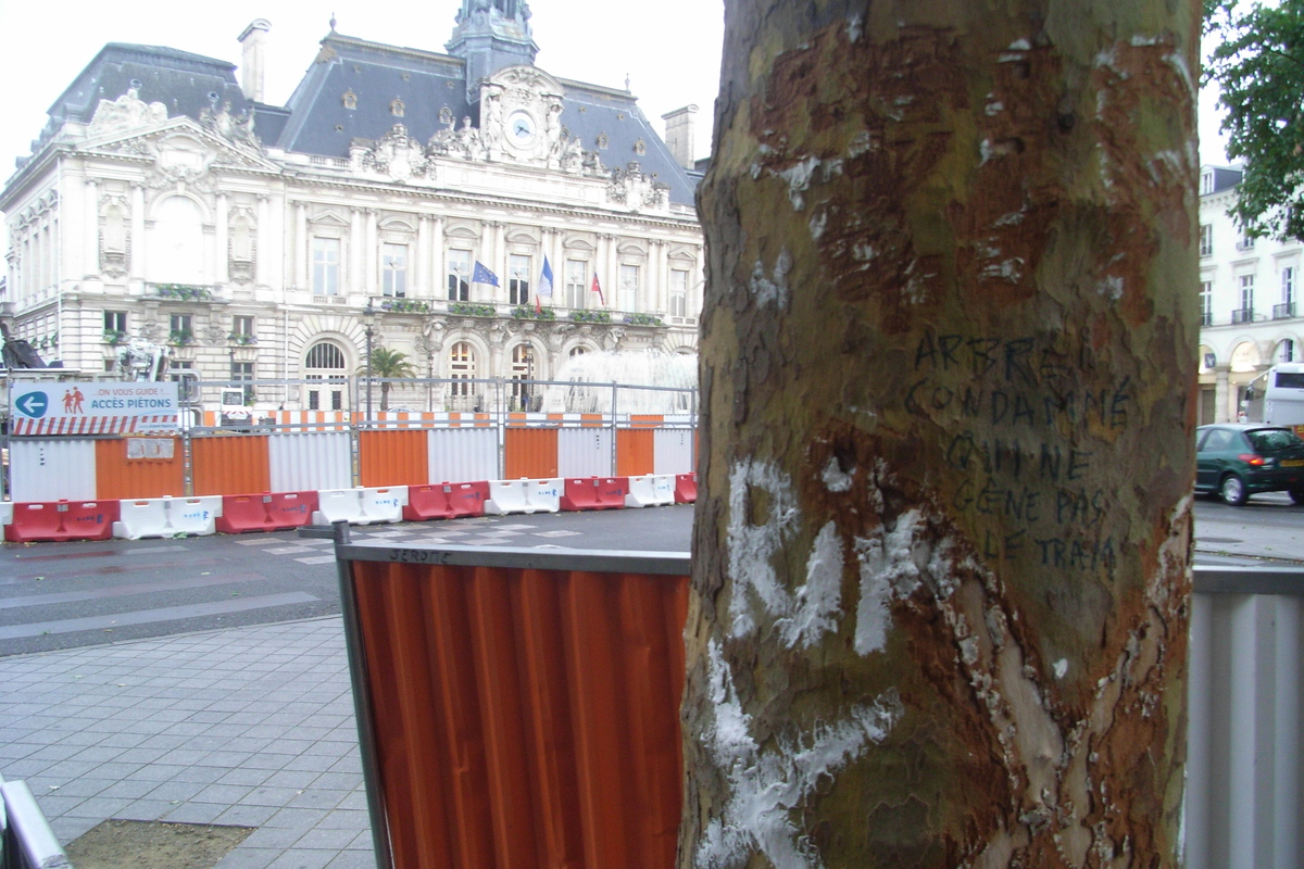 Hier, 30 novembre, se tenait en mairie une réunion portant sur la portion Anatole France - Gare de Tours du tramway. Les mois se suivent et la propagande continue et s'intensifie même. Ainsi, de la réunion du 2 juin à celle-ci, le nombre des arbres plantés est passé de 1400 à 3000 (1400 + les 500 de septembre plus les 2x500 plantés en 2 ans sur toute la ville)... C'est formidable. Et, bien sûr, rien n'a été dit dans la présentation sur le fait qu'aucun arbre ne sera planté sur la portion concernée par la réunion. Et bien sûr, il n'y fut pas question de la vingtaine de platanes abattus pour rien. C'est donc sur eux que j'ai posé ma question : pourquoi ?