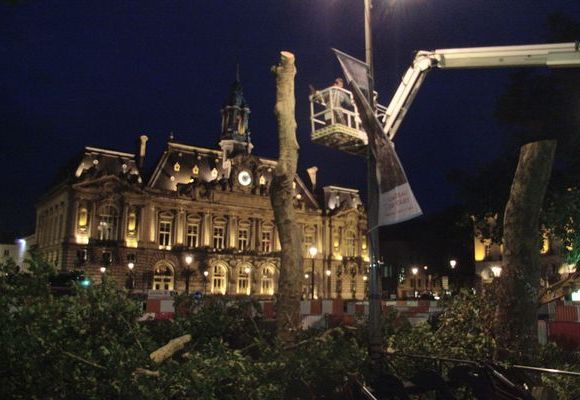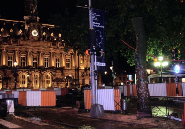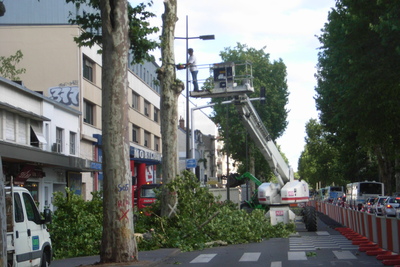 6 platanes ont été abattus hier, notamment hier soir de 21 heures à minuit devant l'hôtel de ville sous une pluie battante. Plus de branche, plus de tronc à terre, tout était nettoyé à minuit.