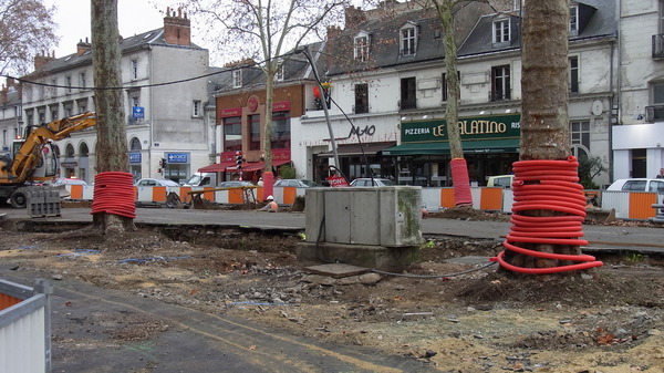 - Enlever tous les arbres avoisinants pour on ne sait trop quelle opération urbanistisque sans rapport avec le tracé du tramway. C'est ce qui s'est passé du côté nord avec 12 platanes abattus qui ne gênaient ni le tram ni la voirie. Abattages gratuits, comme il y en eut des centaines d'autres sur tout le parcours. 8 des 12 platanes ont été transplantés parce qu'ils étaient jeunes, ça ne change pas grand chose, ils ne sont plus ici. Et j'ai vu trois d'entre eux avant-hier, plantés au bout du boulevard Heurteloup, près de l'autoroute, je pense qu'ils sont en train de mourir. Ils ont servi à faire de la comm' d'écoblanchiment...