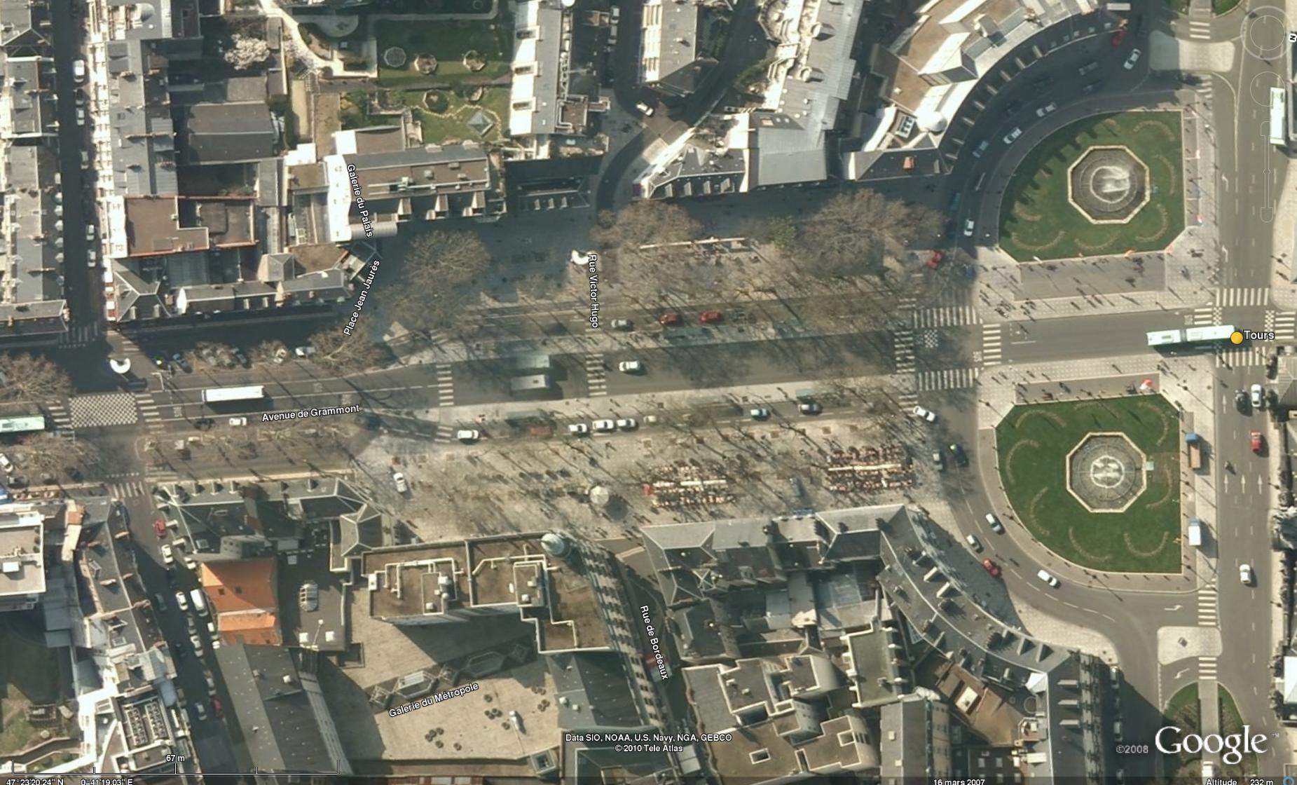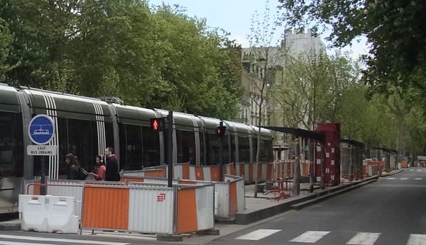 Les travaux pour le passage du tramway ont déjà été réalisés en bonne part il y a quelques années. Les quatre voies centrales sont déjà réservées pour le tram, les bus et la station, les voies de circulations latérales (entre la 1ère et la 2ème rangée de platanes) sont en place, on les voit bien sur la photo Google-Earth ci-dessous à gauche (cliquez dessus pour élargir).