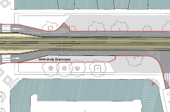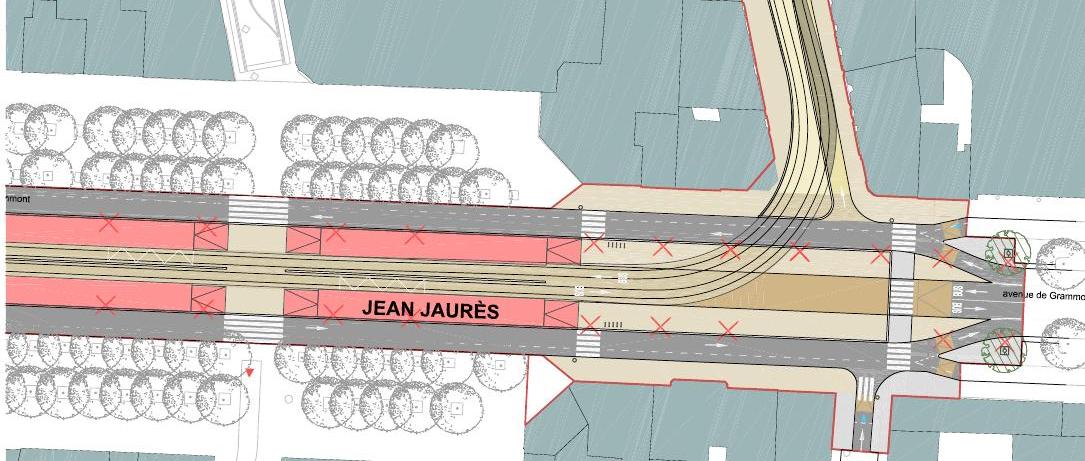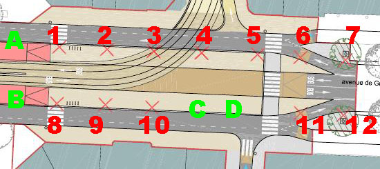 Donc les 12 platanes qui sont sur la station Jean Jaurès peuvent être sauvés. Voyons maintenant les 12 autres jusqu'à la rue Charles Gille, sachant que, là, les deux voies latérales de circulation ne sont pas encore en place (mais il y a deux voies de dégagements qui correspondent). Considérons attentivement le plan suivant :