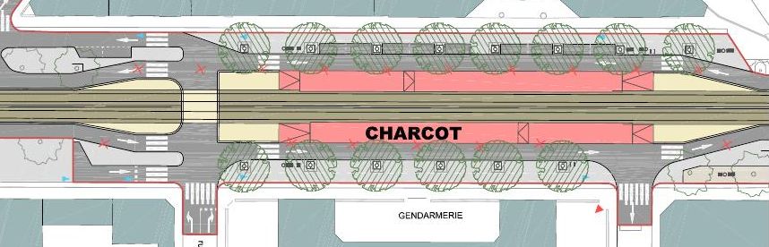 Voici ensuite le tracé à la station Charcot, entre la place de la Liberté et le carrefour de Verdun (le sud est à droite) :