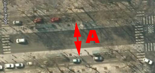 L'espace A entre les deux voies de circulations latérales est égal à 14,5 mètres d'après l'échelle Google et mes calculs. Sur le tracé du tram à droite, l'espace B entre les deux voies de circulations latérales est égal à 14,4 mètres d'après l'échelle et mes calculs. On a donc A = B, cela signifie que les travaux de chaussée pour les voies latérales ont été effectuées correctement il y a quelques années et qu'il n'y aura pas besoin de revenir dessus. On pouvait en douter tant, sur l'image de droite du tracé, les croix rouges sont très près du bord et laissent croire qu'il est inévitable d'abattre les platanes. C'est faux, puisque c'est la disposition actuelle qui ne changera pas.