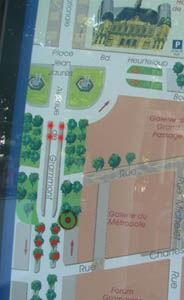 Sur place, j'ai remarqué un nouveau plan du quartier, ci-contre. J'ai mis un point rouge sur les arbres qui doivent être abattus injustement (avec une voirie, qui on le voit encore est inchangée). Sur les 10, 6 semblent survivre, est-ce un signe ?