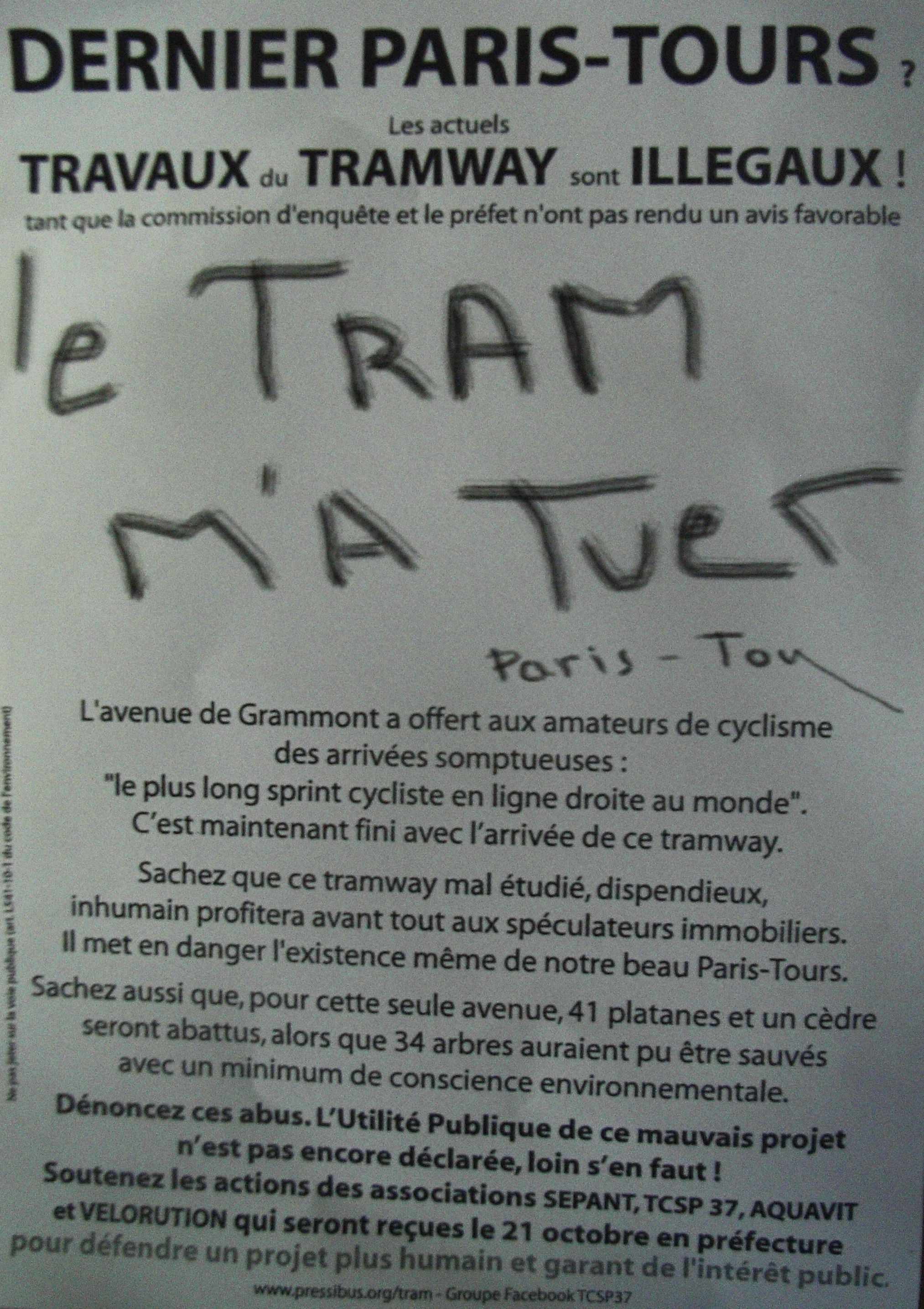 Le 10 octobre, se déroule la dernière course cycliste Paris-Tours se terminant place du Palais (Jean-Jaurès) (les rails de tram ne le permettront plus...), là où 20 platanes doivent être abattus pour rien. C'est l'occasion de le rappeler à l'occasion d'un tract distribué après la course. Et d'affirmer l'illégalité des travaux en cours. Je ne n'ai pas rédigé ce tract, que j'approuve (même si je trouve trop peu interrogative l'accroche du dernier Paris-Tours), puisque l'adresse du présent blog est citée.