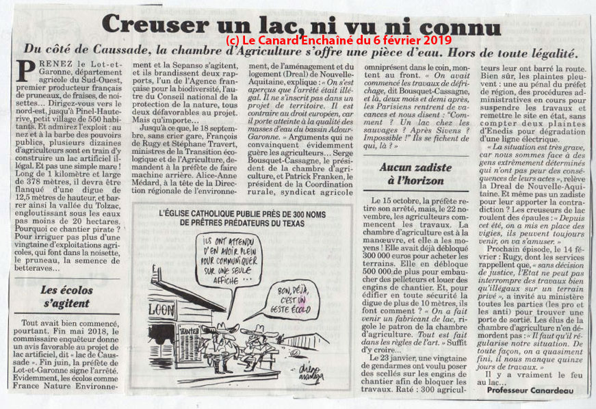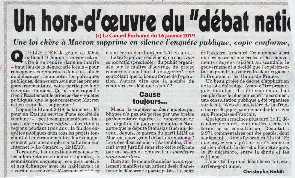 [en complément, voici deux articles du Canard Enchaîné révélateurs du délitement de notre démocratie. L'Etat de Droit est trop souvent bafoué dans notre pays, en catimini. Le premier article, du 16 janvier 2019, montre que le gouvernement a cherché à supprimer les enquêtes publiques (bien que muselées, elles dérangent encore trop). Le second, du 6 février 2019, montre que même quand il essaye d'échapper aux lobbies, ici agricole, le gouvernement cède rapidement, les médias sont discrets... Derrière cette démocratie du "Cause toujours, vous finirez par vous lasser et accepter", les discours de type "Tolérance Zéro" (pour qui ?) prennent un sinistre relief... A. B. , le 6 février 2019]