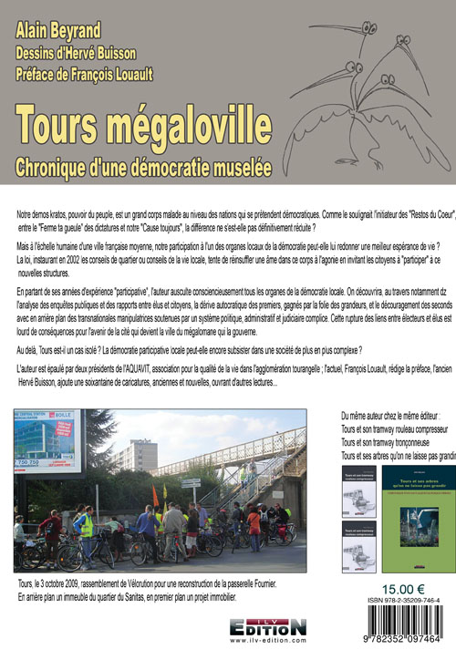 Notre demos kratos, pouvoir du peuple, est un grand corps malade au niveau des nations qui se prétendent démocratiques. Comme le soulignait l’initiateur des "Restos du Coeur", entre le "Ferme ta gueule" des dictatures et notre "Cause toujours", la différence ne s'est-elle pas définitivement réduite ? Mais à l’échelle humaine d'une ville française moyenne, notre participation à l'un des organes locaux de la démocratie peut-elle lui redonner une meilleur espérance de vie ? La loi, instaurant en 2002 les conseils de quartier ou conseils de la vie locale, tente de réinsuffler une âme dans ce corps à l’agonie en invitant les citoyens à "participer" à ces nouvelles structures. En partant de ses années d’expérience "participative", l'auteur ausculte consciencieusement tous les organes de la démocratie locale. On découvrira, au travers notamment de l’analyse des enquêtes publiques et des rapports entre élus et citoyens, la dérive autocratique des premiers, gagnés par la folie des grandeurs, et le découragement des seconds avec en arrière plan des transnationales manipulatrices soutenues par un système politique, administratif et judiciaire complice. Cette rupture des liens entre électeurs et élus est lourd de conséquences pour l'avenir de la cité qui devient la ville du mégalomane qui la gouverne. Au delà, Tours est-il un cas isolé ? La démocratie participative locale peut-elle encore subsister dans une société de plus en plus complexe ? L'auteur est épaulé par deux présidents de l'AQUAVIT, association pour la qualité de la vie dans l'agglomération tourangelle ; l'actuel, François Louault, rédige la préface, l'ancien, Hervé Buisson, ajoute une soixantaine de caricatures, anciennes et nouvelles, ouvrant d'autres lectures... ![]() |