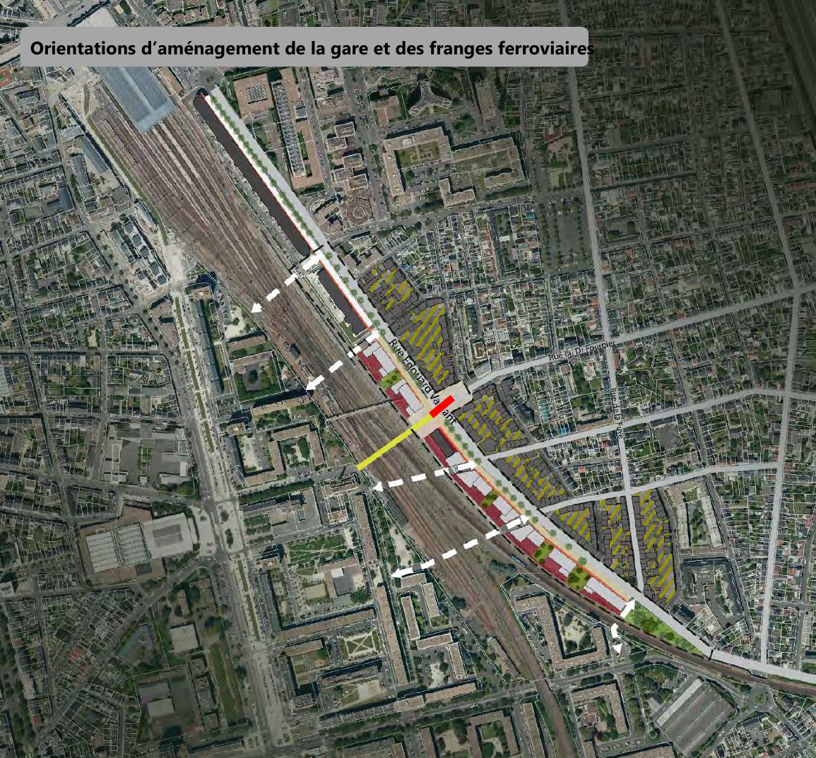 J'ai ajouté trois lettres sur ce plan. En A il y a un mignon petit square avec un grand cèdre, des bancs. En B il y a un ginkgo biloba qui commence à prendre de l'âge et qui est magnifiquement placé devant un immeuble incurvé. Je fais souvent un détour pour l'admirer, avec le plaisir de passer par le square A. En C, il y a un petit coin ombragé avec des bouleaux, des bruyères... c'est privé mais accessible au public, très bien entretenu. Et il est plaisant de discuter avec un habitant de l'immeuble de leur espace privilégié. Je demande bien sûr leur préservation intégrale. 3) La gare et les franges ferroviaires