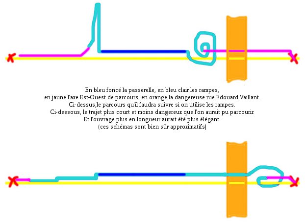 Je l'ai déjà proposé il y a quelques années (http://pressibus.org/passerelle) avec ces deux schémas qui peuvent maintenant être juxtaposées (le côté Ouest peut aussi être raccourci pour les vélos) :
