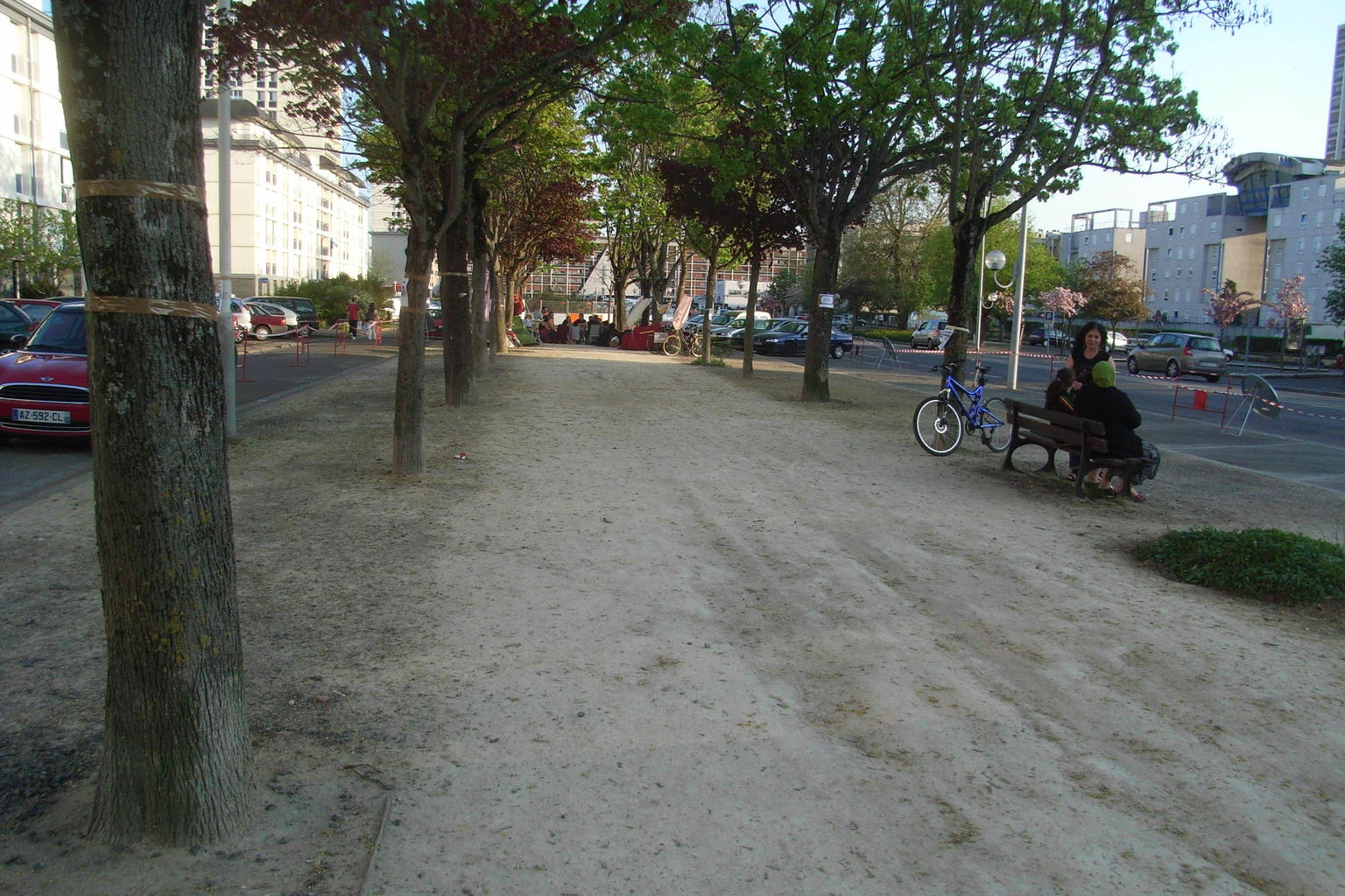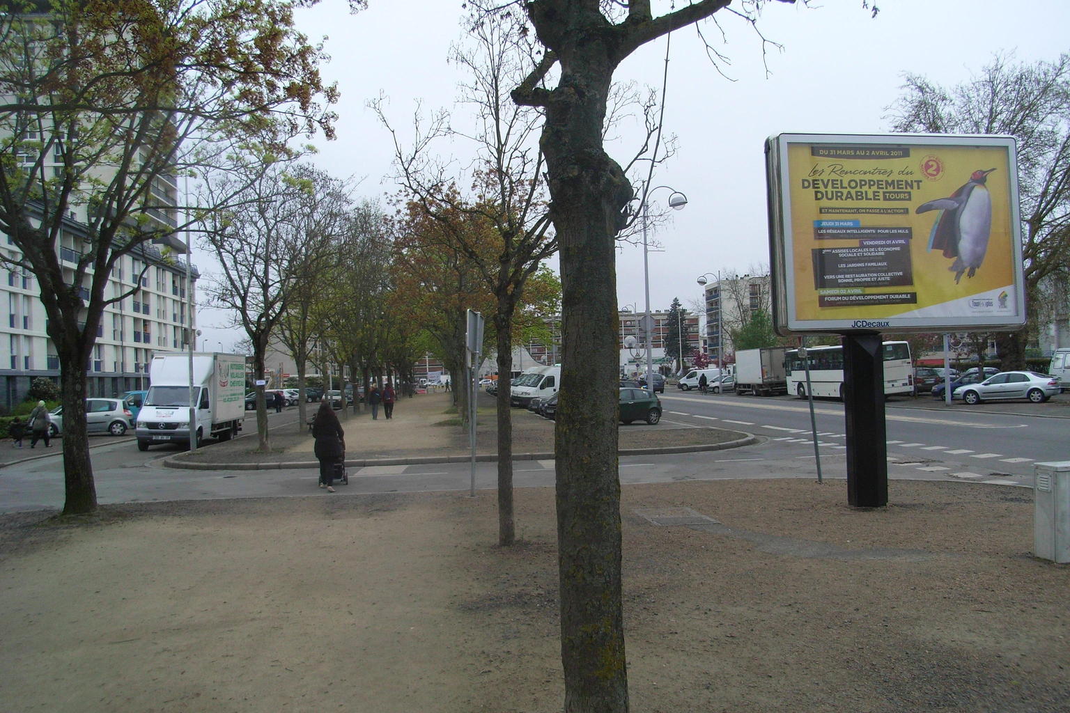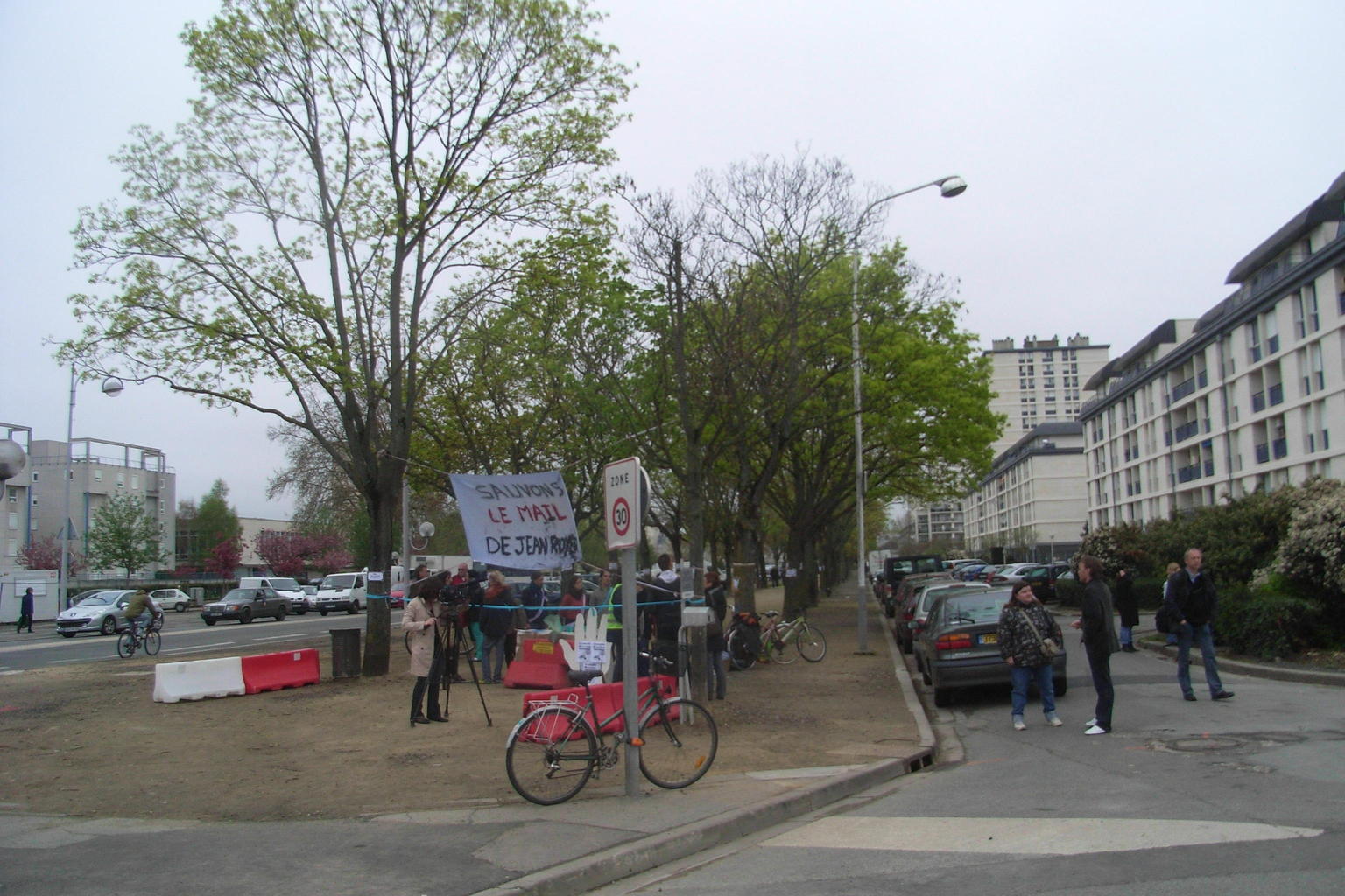 _09 C'est sur la droite du mail (côté ouest), à la place du parking en épi et du panneau que nous avions demandé que passe le tramway, idée reprise par les commissaires enquêteurs. Le tracé alternatif de 2009, lui, faisait passer le tram au milieu de la voie routière. |