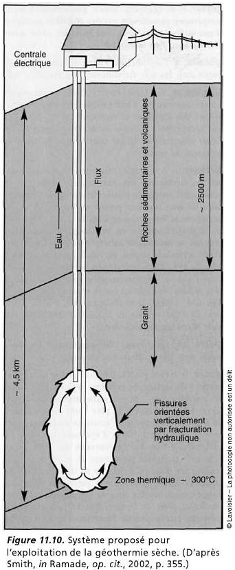Sur cette page de 2006 : "La géothermie sèche consiste à injecter un fluide froid dans un réseau fracturé de roches chaudes. On peut accélérer la fracturation en injectant le liquide sous pression. Ce type de géothermie est encore expérimental et est principalement limité aux zones à fort gradient géothermique".