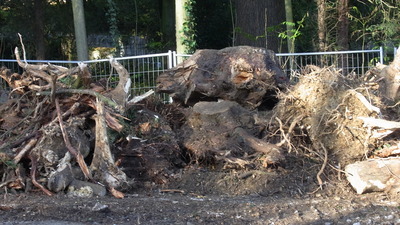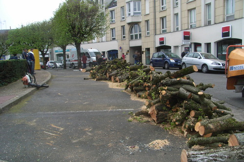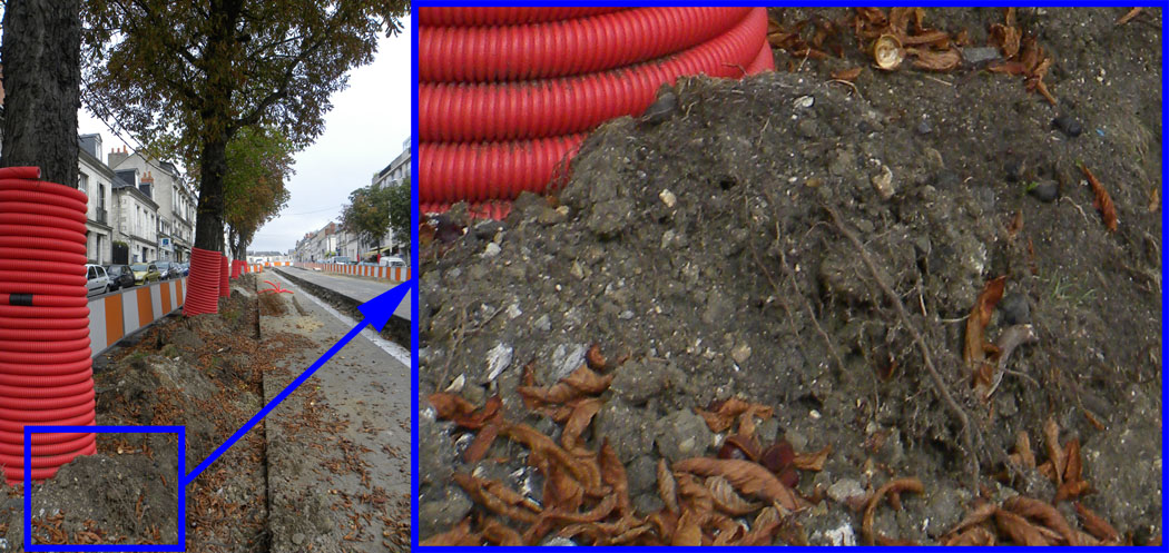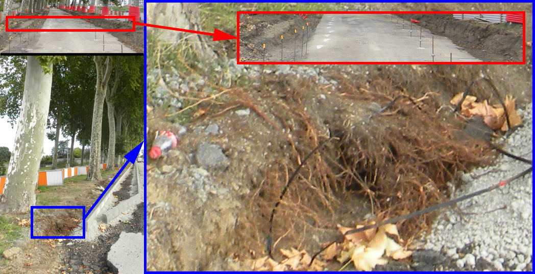 | Dimanche vous avez vu un spectacle désolant. Si vous aviez parcouru le tracé Tranchée Europe vous auriez été encore plus désespéré. Avenue de Jemmapes ça ressemble au Sanitas. Avenue de l'Europe les cerisiers ont les racines à nu, depuis 15 jours pour certains, ils sont comme posés sur un cercle de terre dont le diamètre est à peine le double de celui de leur tronc ! Maintenant c'est le tour des cèdres restants d'exposer leurs racines bien hachées même ceux qui sont hors parcours ! On abat moins mais on fait crever ! |