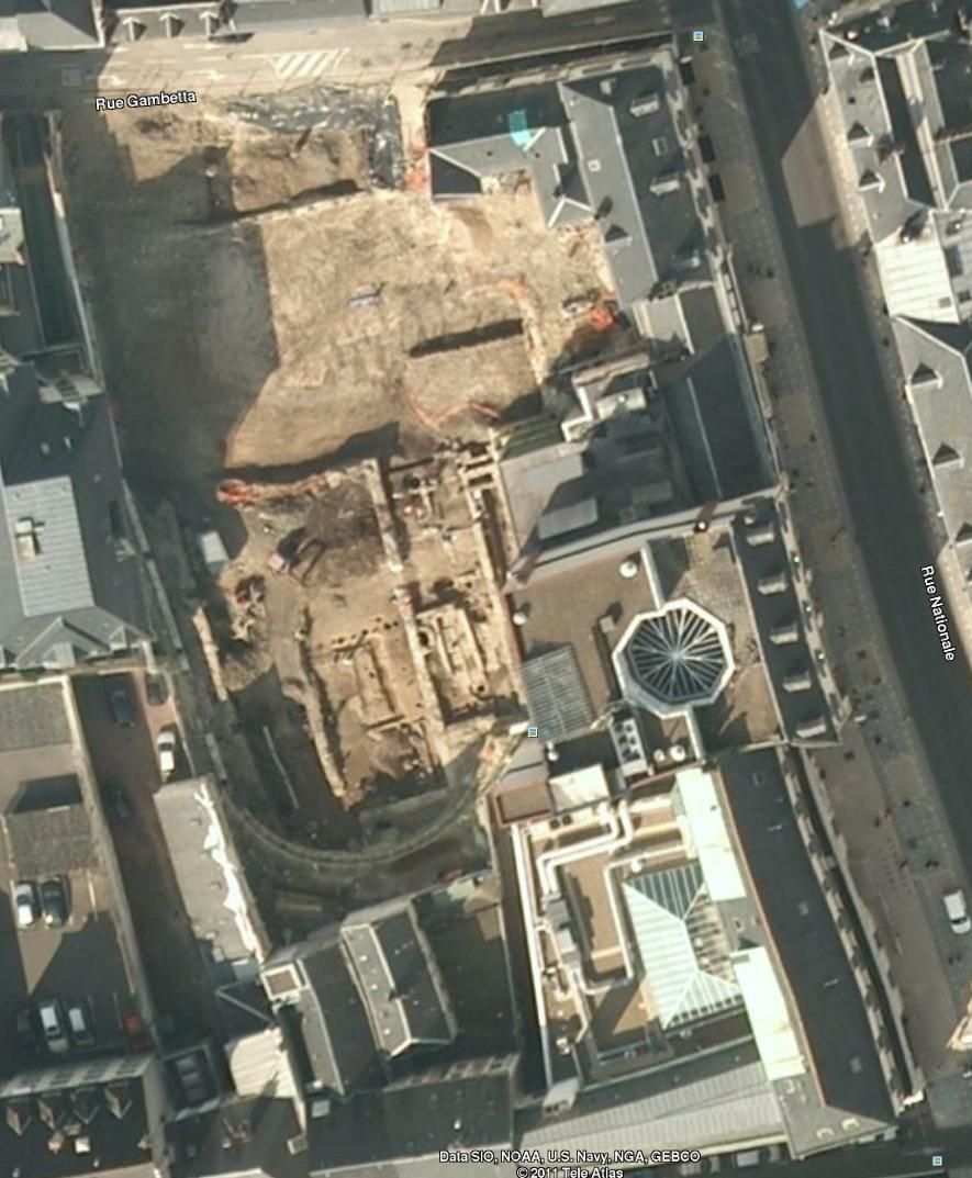 Rue Nationale, les recherches archéologiques ont apparemment été faites à la va-vite, pas grand chose n'a été trouvé. Il n'y a rien eu de comparables aux photos ci-dessus de zones très voisines. Dommage, mais là comme ailleurs, le rouleau-compresseur a tout balayé. Je clos cette page par un lien sur cet article montrant l'intérêt des recherches archéologiques en France.