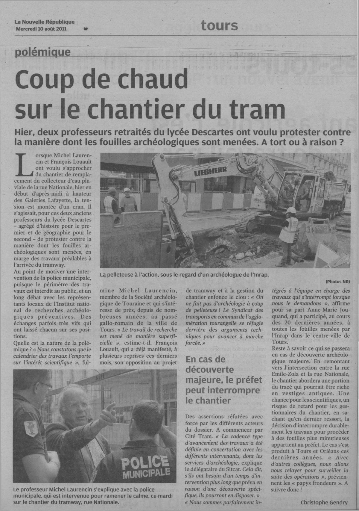La Nouvelle République revient sur les travaux en cours en un article (ici) où un responsable de l'INRAP assure que le protocole d'intervention permet de "demander jusqu'à trois jours d'interruption de travaux pour mener les fouilles à bien". Ne suffirait-il pas de trois heures ?