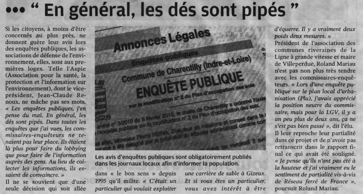 On l'a appris le samedi 14 mai (ici), le référé-suspension a été rejeté par le tribunal administratif d'Orléans, alors le sujet de fond, le recours lui-même, ne sera jugé que dans quelques mois. Du côté du PLU, les conclusions du commissaire enquêteur ont été mises à disposition (ici). Même si c'est globalement moins mauvais que pour le tramway, ce n'est vraiment pas brillant. Il est vrai qu'avec cette déclaration préliminaire "l’enquête publique ne saurait prétendre à remanier profondément le document tel qu’il est présenté et encore moins à le rejeter", comment voulez-vous qu'une enquête publique change grand chose ? Les dés sont pipés, comme le titrait la NR en mars 2010 (ici). Maintenant, elle ne tiendrait plus de tels propos tant elle est devenue organe de propagande, comme je le montre ici, à propos du compte-rendu du conseil municipal du 30 mai.