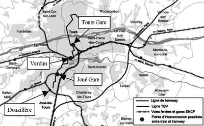 L'étoile ferrovaire tourangelle et le tracé de la première ligne de tramway. Schéma paru sur "Vues d'actu" n°4 (septembre 2008, publié par atu) (en couleurs et élargi sur la page voisine Convergence). Les noms des correspondances possibles sont ajoutés.