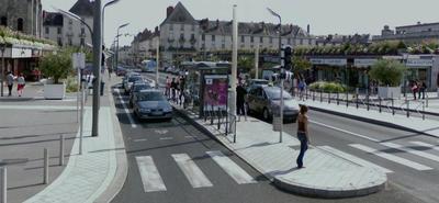La suite du parcours dans la capitale du jardin de la France est autant néfaste, la "minéralisation" se renforce au détriment des espaces verts alors qu'elle aurait dû et pu régresser. Aucun arbre n'est planté dans la rue Nationale, elle reste entièrement minéralisée, alors que c'était l'occasion de remplacer les palmiers et oliviers en pots (très ligériens, sûrement...). Puis, alors qu'ils ne gênent pas, les platanes au bord du tracé sont abattus entre la place Jean Jaurès et la rue Charles Gille, qui perd ses quatre arbustes (ce qui n'est pas indiqué dans les dossiers d'enquête). Juste après, le long de la gare où l'espace est élargi, les plantations (arbres ou massifs) sont à nouveau négligées au profit des sales dallages gris. Oui, on avait une occasion d'embellir la ville, d'y développer la trame verte, les sagouins municipaux ont préféré l'enlaidir.