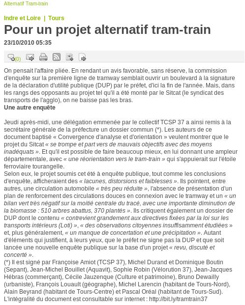 sur le blog d'Arnoul Maffre, la page Tram-train : la fausse bonne idée ?, avec notamment les réactions de Jean-Pierre Lapaire, conseiller tramway du maire de Tours (commentaire 9 : "Un syndicat de mécontents, d'horizons bien divers et d'intérêts divergents, se permettent de démolir un rapport..."), et David Chollet (commentaires 29, 32, 33), conseiller municipal Vert de la majorité.