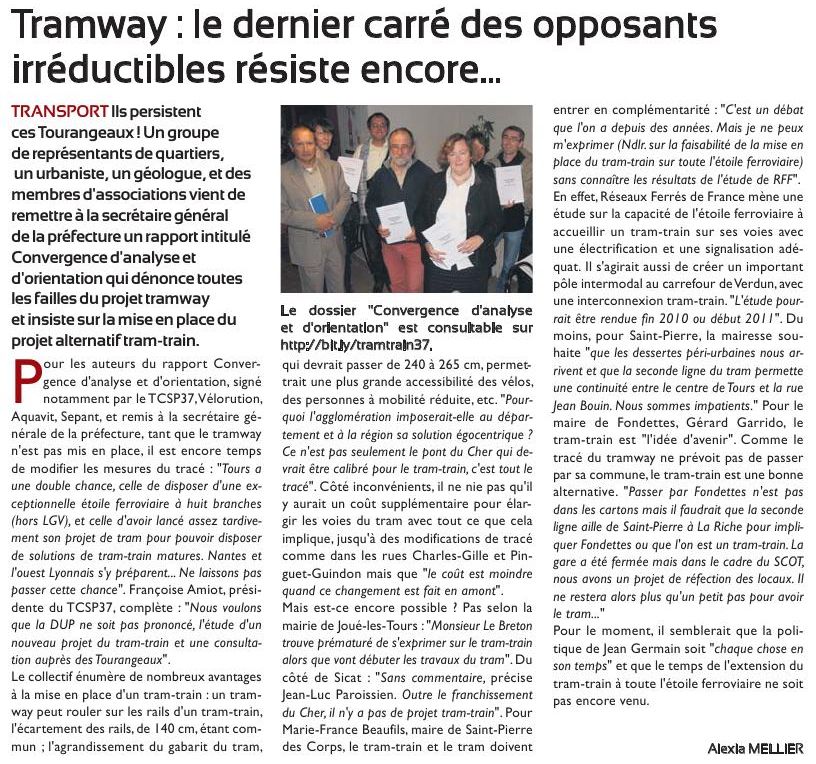 Le document de convergence, remis le 21 octobre 2010 à la préfecture d'Indre et Loire, fut dans la foulée remis à la presse, qui en fit un compte-rendu, ici pour la Nouvelle république, et là pour la Tribune de Tours.