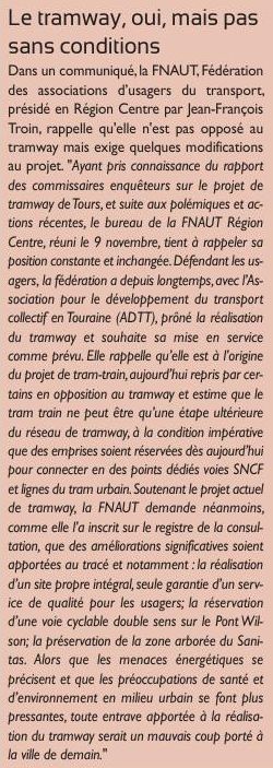 Ci-contre (Tribune de Tours du 18 novembre), la réaction de la FNAUT Centre (Fédération Nationale des Associations d'Usagers des Transports), association qui depuis longtemps agit pour l'arrivée d'un tram à Tours, est caractérisée par des ambiguïtés marquées :