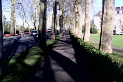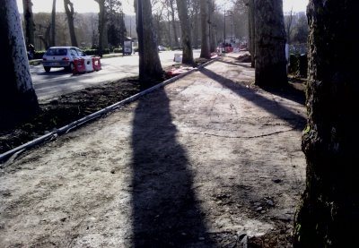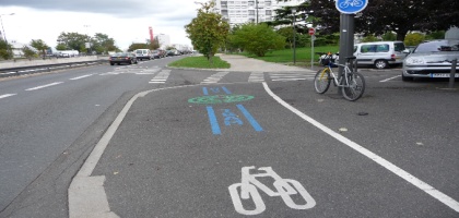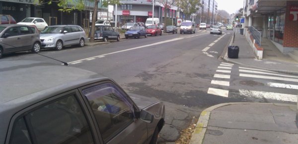 | Sur la longueur de 1,4 km de la première moitié de cette rue, on se retrouve avec un cheminement chaotique pour les vélos qui, du nord au sud, ont, tenez-vous bien, successivement : aucune bande cyclable, puis deux sur la chaussée, puis une seule sur la chaussée, puis aucune, puis une sur le trottoir, puis une sur la chaussée, puis deux sur la chaussée, puis aucune, puis deux sur la chaussée, puis deux dont une sur la chaussée et l'autre sur le trottoir, puis une sur la chaussée. Visiblement, c'est du "n'importe quoi", cela a été pensé dans le très court terme, au fur et à mesure de la mise en place des tranches immobilières. |