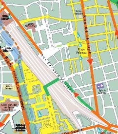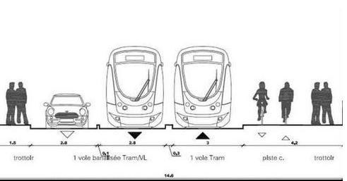 A gauche, sur le plan vélo de la ville, la rue Edouard Vaillant a 3 discontinuités. Ci-dessus, sur un document tramway de l'agglo, il n'y a aucune discontinuité, on laisse croire qu'il y a 1,4 km de liaison cyclable. En réalité, il y a 11 discontinuités, ces deux documents sont donc incorrects. Ils enjolivent une circulation cycliste chaotique. |
