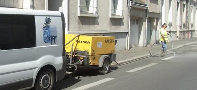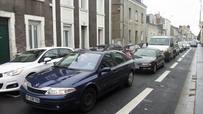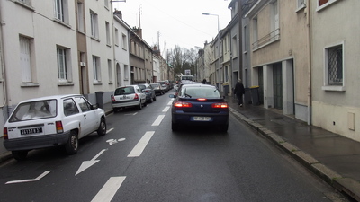Rue de la Fuye avec l'ancienne disposition qui est en train d'être effacée dans un bruit assourdissant (gaspillage d'argent public et d'énergie...). La bande cyclable est sur la droite du sens de circulation commun aux automobiles et aux cyclistes (à gauche sur la photo). Les deux circulations sont séparées par le ruban blanc pointillé de la piste. Les cyclistes ne peuvent pas aller dans le sens contraire, c'est facilement possible sur des voies parallèles proches. (photos du 29 août 2012) |