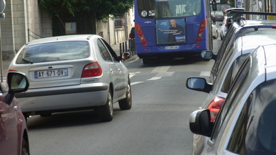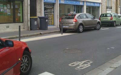 Une situation assez fréquente : un cycliste dans le sens des voitures est en contresens sur le contresens cycliste, ce qui est interdit maisplus sécurisant, derrière la bande blanche continue à ne pas franchir par les véhicules... |