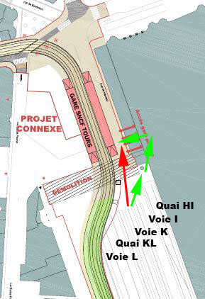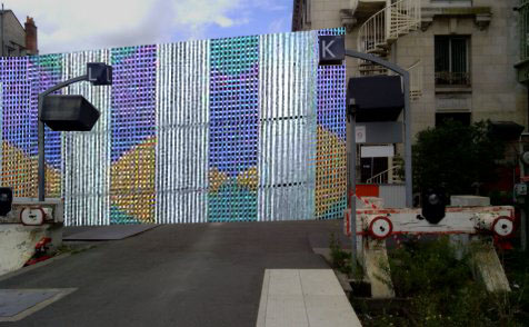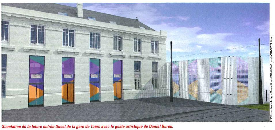 Cette juxtaposition des lignes de tramway et de train, certes déjà utile, devrait acquérir une pertinence plus forte si une ou plusieurs lignes de tram-train pouvaient à l'avenir y aboutir, notamment une ligne provenant de St Pierre des Corps (ou de plus loin), incluant l'actuelle navette. Voici donc la ligne de tramway qui vient tout près de la gare et de ses voies numérotées H, I, K et L et donc des quais HI et KL, très utilisés. Sur ce côté Ouest de la gare, il était naturel d'imaginer un passage très facile d'un quai à l'autre, sans aucun obstacle comme du côté Nord à l'entrée principale ou du coté Est de la rue Edouard Vaillant. Hé bien non, pas du tout, figurez-vous qu'entre le quais de train et de tramway, il faudra contourner... une palissade !! On peut deviner que la SNCF (ou RFF), habituellement réticente aux demandes des municipalités, est à la base de cette bêtise kafkaïenne. Comment a réagi la mairie de Tours (ou le Sitcat, présidé par le maire...) ? Plutôt que de dénoncer ce tracas inutile et mettre en place une structure très légère en attendant que SNCF-RFF revienne à de meilleurs sentiments (lors d'une collaboration pour le tram-train, par exemple...), elle a préféré ériger une grande palissade, et pas n'importe laquelle, une "oeuvre d'art" réalisée par un artiste de réputation mondiale, rien que ça ! Voyez, ci-dessous, à droite, combien cette palissade de Daniel Buren sera belle ! |