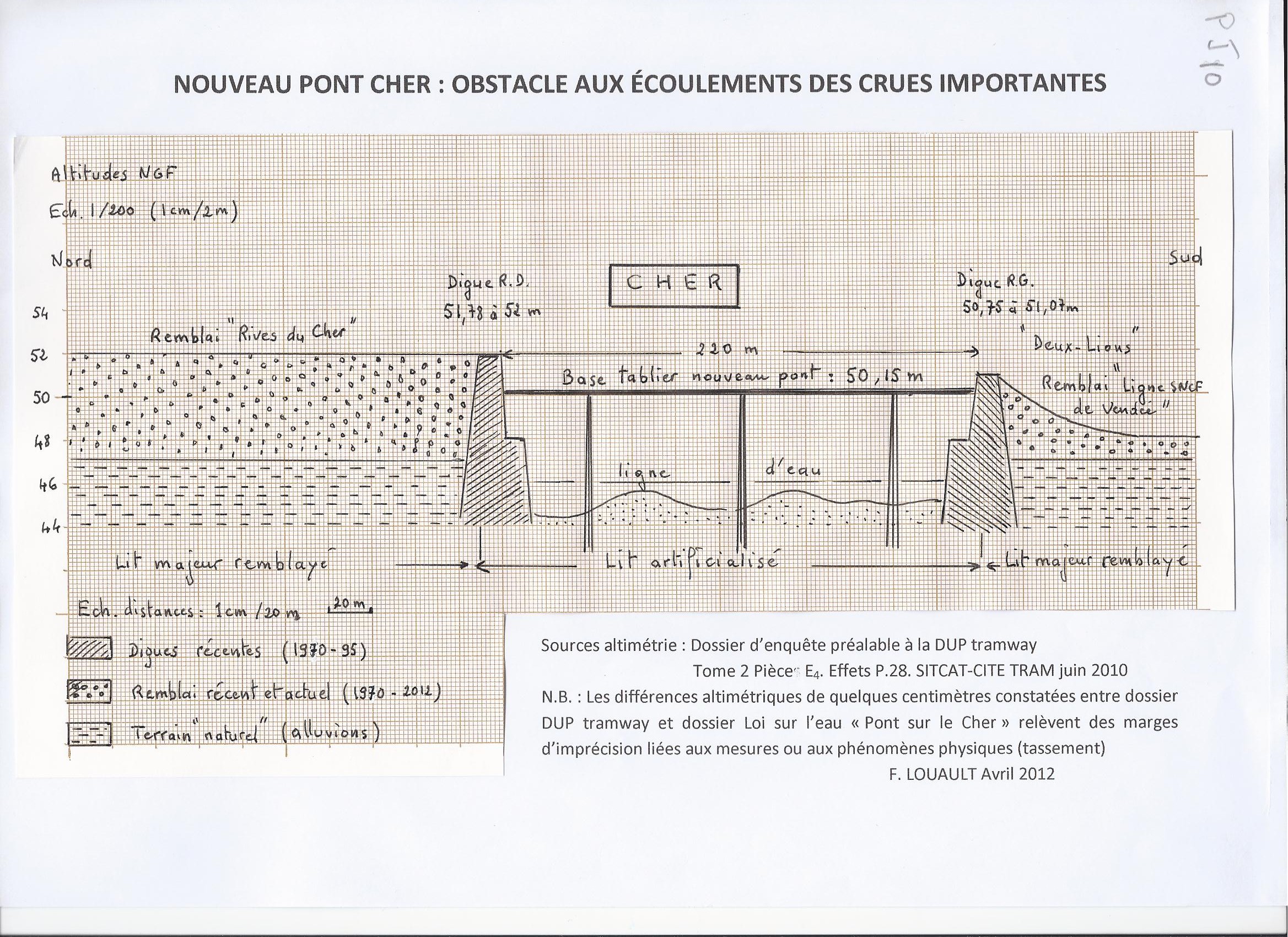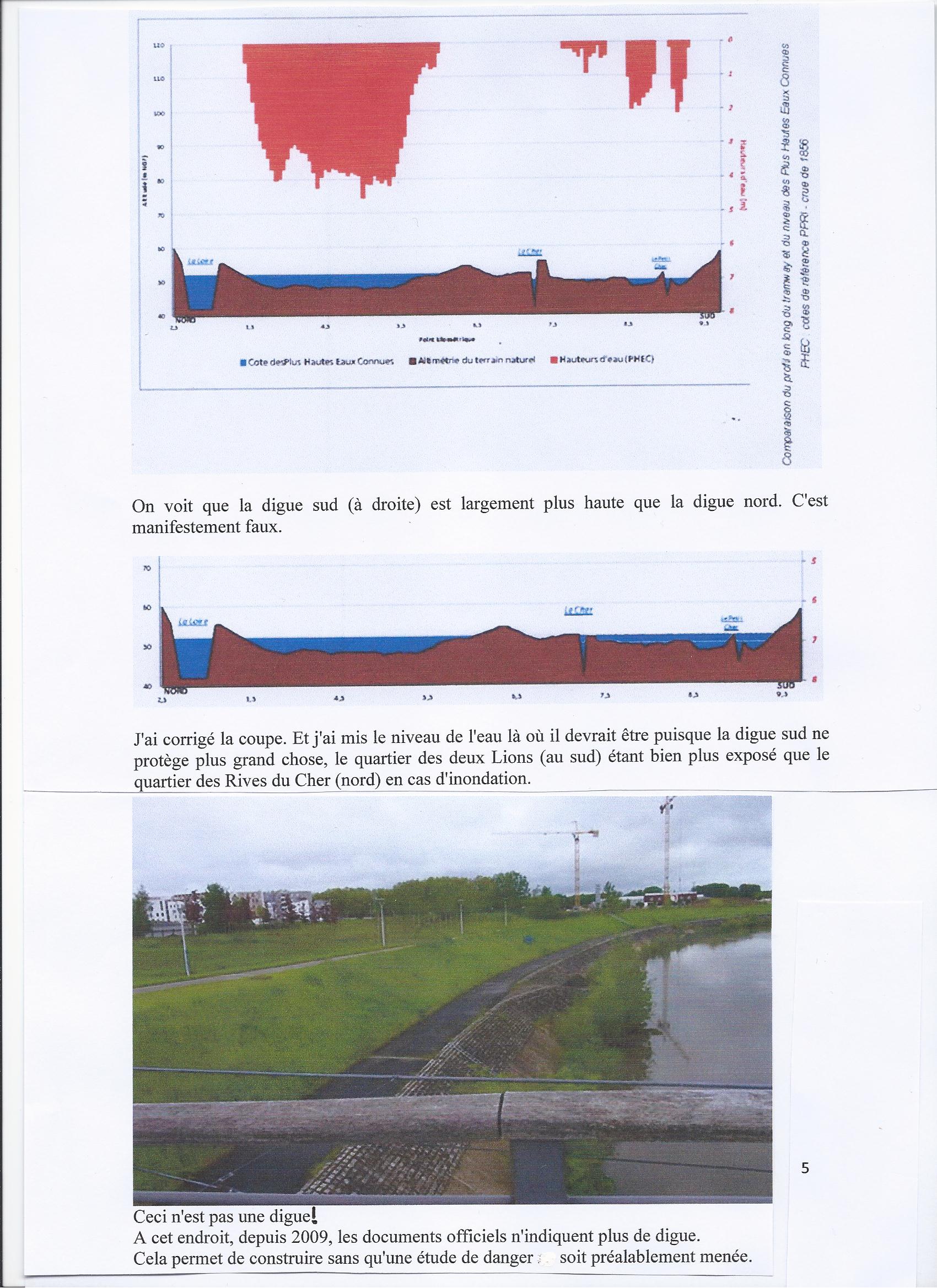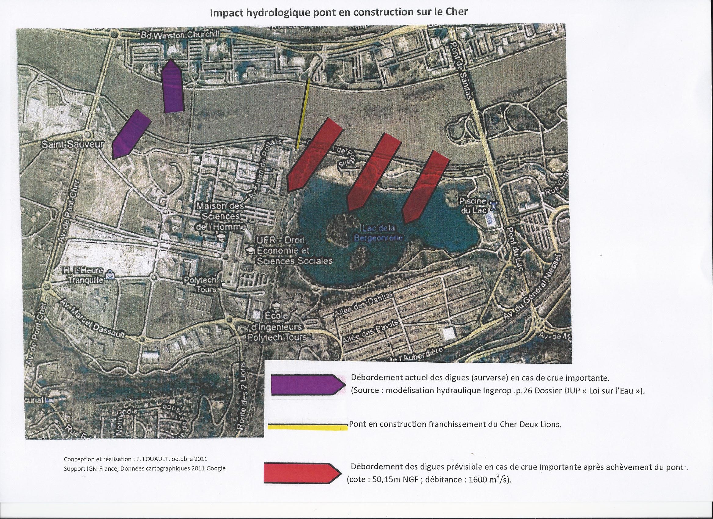 Se révèlent actuellement à Tours des faits d’une extrême gravité en matière de protection des riverains contre le risque d’inondation et qui relèvent directement de votre autorité. Le lancement du chantier de tramway en 2010 a conduit à l’implantation d’un ouvrage de franchissement du Cher (pont) au cœur d’un chantier d’ « endiguement-artificialisation » considéré aujourd’hui comme le tronçon le plus exposé au risque d’inondation de tout le bassin de Loire Moyenne. Et reconnu comme tel par tous les spécialistes et responsables locaux, y compris par vos services, puisque le périmètre hydrologique Val de Tours fait partie de la liste des vingt territoires à risques d’inondation importants (T.R.I.) du bassin de Loire Bretagne que vous venez de délimiter dans le cadre de la mise en œuvre de la Directive Inondation (2007/60/CE). Cette dangerosité se trouve confirmée par plusieurs études et modélisations récentes dont vous disposez : modélisation Ingérop étude d’incidence DUP Loi sur l’Eau (2010), bilan du comité de pilotage « Etude de dangers » Val de Tours (2011), travaux préparatoires à la révision du PPRI Val de Tours-Val de Luynes (2012). Toutes font le même constat : le lit du Cher se referme rapidement sous l’effet de l’alluvionnement au droit du quartier des Deux Lions, entre le pont Saint Sauveur reconnu de longue date comme un dangereux verrou faisant obstacle à l’écoulement des crues importantes, et l’ouvrage en construction imprudemment sous dimensionné, qui transfère plus en amont le risque d’inondations fréquentes : Quartiers Fontaines, Vrillonnerie, Deux Lions. Le pont dont le tablier est positionné 2 mètres en dessous du sommet des digues de protection ne laisse aucune marge de sécurité. Ce choix contrevient aux exigences altimétriques imposées par les bureaux d’étude lors des travaux d’artificialisation (SOGREAH 1970 et L.N.H. de Chatou 1989). Plus grave encore cette évolution résulte de graves négligences et dysfonctionnements de l’administration : étude d’incidence réalisée par le maître d’œuvre lui-même, ce qui sous entend un conflit d’intérêt ; enquête publique Loi sur l’Eau reposant sur des documents contestables, voire truqués (Cf. P.J.1) ; Commission d’Enquête insensible aux inquiétudes des riverains ; propension de la Commission d’Enquête à ne prendre en compte que les arguments du Maître d’ouvrage ; arrêté préfectoral autorisant la construction du pont défaillant et incomplet (absence d’étude de dangers…). Par ailleurs Mr le Préfet d’Indre et Loire a pris la responsabilité en 2009 d’un choix de classement des digues partiel, totalement aberrant et indéfendable. Plus de la moitié des digues du Cher, celles protégeant des enjeux les plus critiques dans la traversée de Tours, ne sont ni répertoriées ni classées. Les gestionnaires des infrastructures sont ainsi déchargés de toute responsabilité en matière de protection contre les inondations. Ce qui fait de ce dangereux tronçon aval du Cher un périmètre de non droit au regard du Code de l’Environnement et de la Loi sur l’Eau. Tout y est donc permis en matière d’infrastructures et d’urbanisme : chenal non entretenu, construction d’un pont, permis de construire accordé dans le chenal de déversement des crues en amont du pont Saint Sauveur (Galion)….En l’absence de digues répertoriées et classées les prescriptions du SDAGE et du PPRI ne s’appliquent pas. Rien ne s’opposerait aujourd’hui à l’urbanisation de la plaine de la Gloriette. Malgré ces manquements la DREAL et la DDT d’Indre et Loire conduisent les études de dangers et travaux préparatoires au PPRI sur des digues administrativement inexistantes. Ces coûteuses études destinées à évaluer l’efficacité du système d’endiguement de la ville de Tours en cas d’inondation ne présentent donc aucune utilité. Vos services se sont pourtant fendus le 17 mars 2011 d’une note de recommandations complètes à l’adresse des services de l’Etat précisant les règles de prudence à respecter durant la phase de révision de ce PPRI. Force est de constater que ces recommandations sont ignorées dans notre département. En dépit des prescriptions du Code de l’Environnement les populations riveraines sont tenues dans l’ignorance des risques objectifs d’inondation qui pèsent sur ce périmètre sud du Cher à la suite des travaux d’artificialisation conduits ici depuis plus de 40 ans. Se souvient-on que plus de 1000Ha du lit majeur du Cher ont été soustraits de l’aire d’expansion naturelle des crues ? A ce jour aucune étude d’impact de ces travaux sur les écoulements dans le chenal artificialisé n’a été réalisée. Le Directeur Départemental des Territoires constate pourtant avec inquiétude la tendance au rehaussement des lignes de crues sous l’effet de la multiplication des îles. Ces comportements sont indignes d’administration ou de services créés pour protéger les populations exposées aux risques majeurs. Saisi par mes soins de ces constats le Tribunal Administratif d’Orléans ne trouve à priori rien à redire sur ces pratiques inquiétantes pour la sécurité des riverains exposés au risque d’inondation. Le jour venu d’une inondation catastrophique, parfaitement prévisible, qui portera la responsabilité des conséquences humaines et financières ? L’assurabilité des biens étant subordonnée au respect des prescriptions fixées par les PPRI et SDAGE. Qui paiera les dégâts compte-tenu des défaillances de l’Etat dans ses devoirs de police administrative ? Que comptez-vous faire pour que les actions préventives contenues dans les divers documents en place (SDAGE) ou en préparation (PPRI) soient enfin respectées ? Veuillez agréer, Monsieur le Préfet de Région, l’expression de mes salutations respectueuses. F. LOUAULT P. J. :