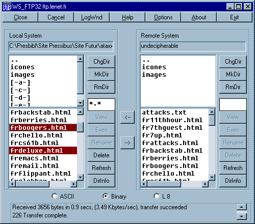 Ci-dessous, la partie gauche représente les fichiers de mon PC, la partie droite ceux de mon fournisseur. En haut, on voit deux répertoires (images et icones) contenu dans le répertoire courant. Deux fichiers sont prêts à être tranférés (bouton -->).