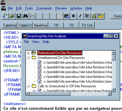 - In Arachnophilia, I use chiefly the site analyser (to see bad internal links...). Sometimes I use it to help me to find an unusual syntax. Also the "recolor tags" option is interesting.