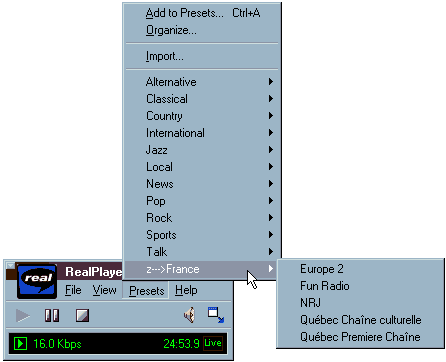 - Ca ressemble à un lecteur audio habituel. Vous cliquez sur un lien du Ouaibe, par exemple au Québec, et, hop !, le Real player se déclenche et en moins de 10 secondes, vous vous retrouvez à l'écoute d'une radio québécoise...