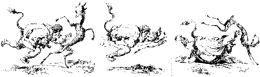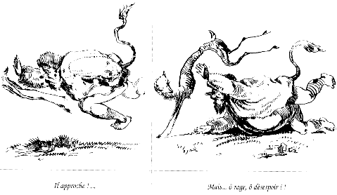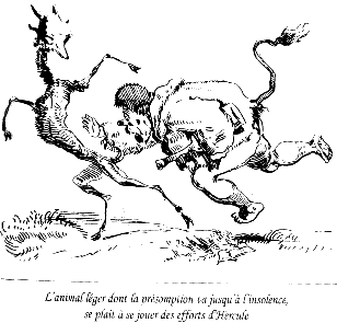 Je ne partage pas ce point de vue et trouve la lecture plus facile en orientant la course dans l'autre sens. La chute du héros apparaît plus lourde et la biche y est plus bondissante. Simplement, Gustave Doré ignorait qu'une "convention de lecture" validerait, bien plus tard, ce sens de déplacement. A.B.