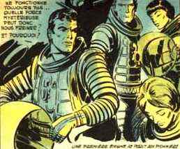 Dessins : Raymond Poïvet (1910-1999) a d'abord travaillé dans la mode. Durant la guerre, il participe au Téméraire. En 1975, il rejoint l'équipe de Vaillant, où, avec Lécureux, il créé avec Lécureux la première série française moderne de SF, Les pionniers de l'Eséparance (outre cette page, voir aussi celle du site pifgadget.com). Pendant cette période, il a aussi dessiné Colonel X, sur des textes de Marijac in 1947, dans Coq-Hardi, et Tumak, fils de la jungle, en 1948-49, dans L'Intrépide. En 1961, avec Jean-Michel Charlier, il crée Guy Lebleu pour Pilote. En 1964, il collabore au bref magazine Chouchou" avec P'tit Gus.