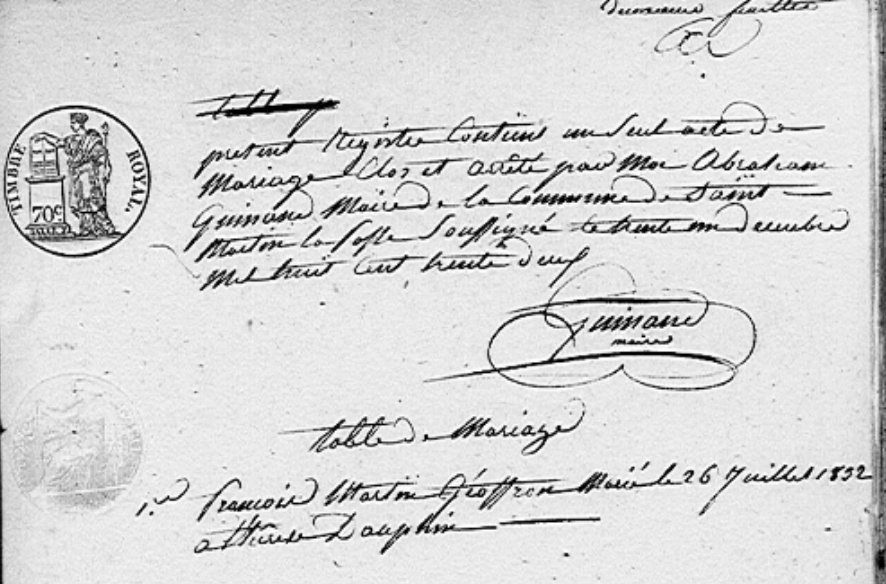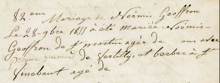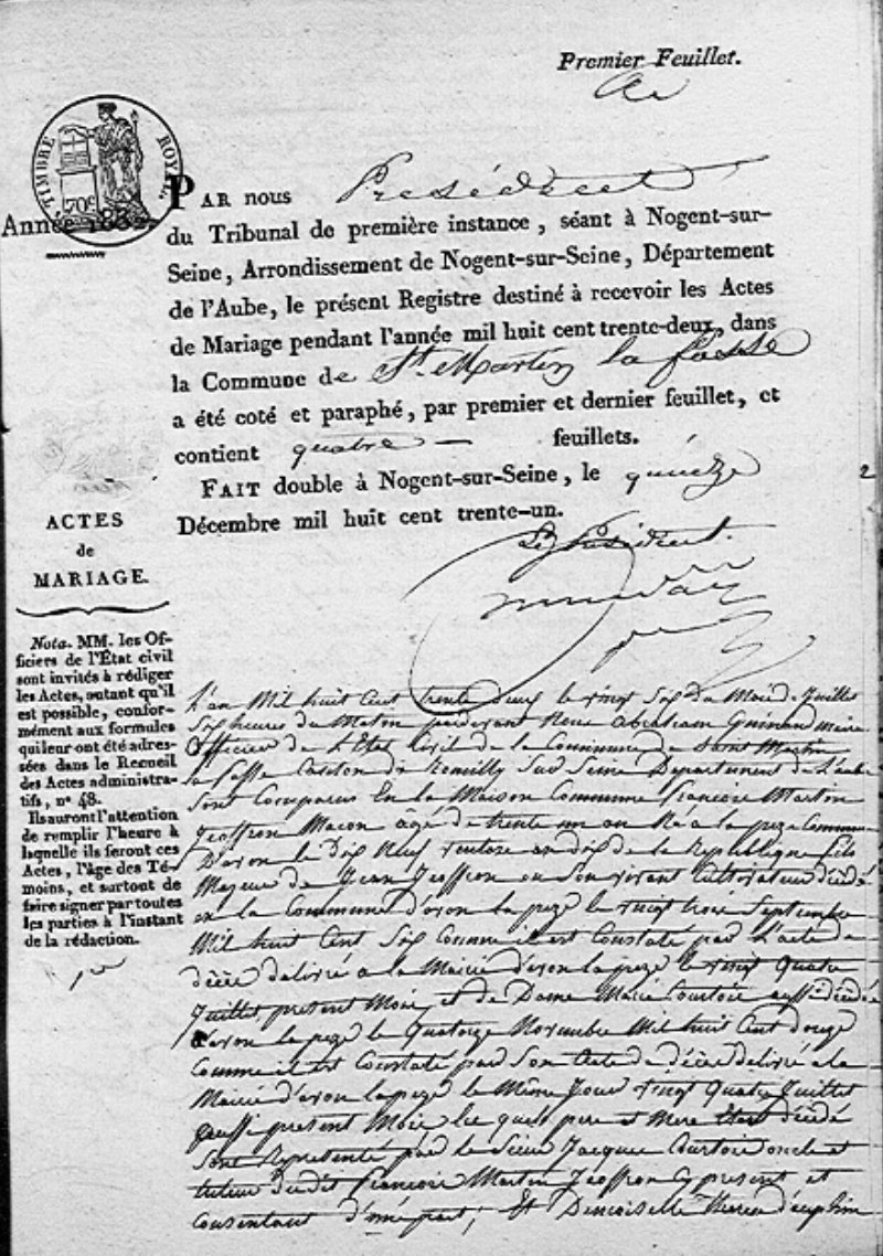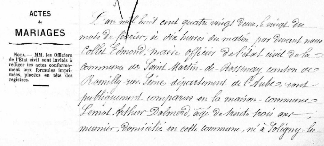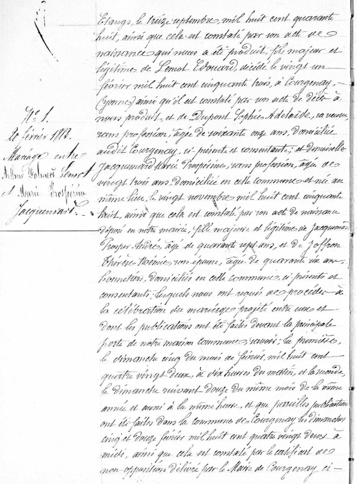 acte de naissance). Elle a 33 ans, il a 40 ans, ils sont cousins à la 7ème génération par les Dauphin et les Hennequin (leurs