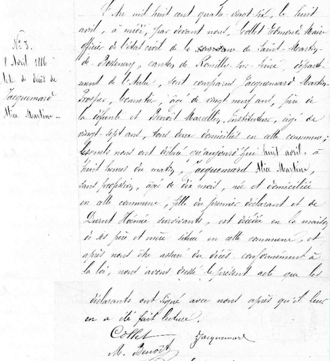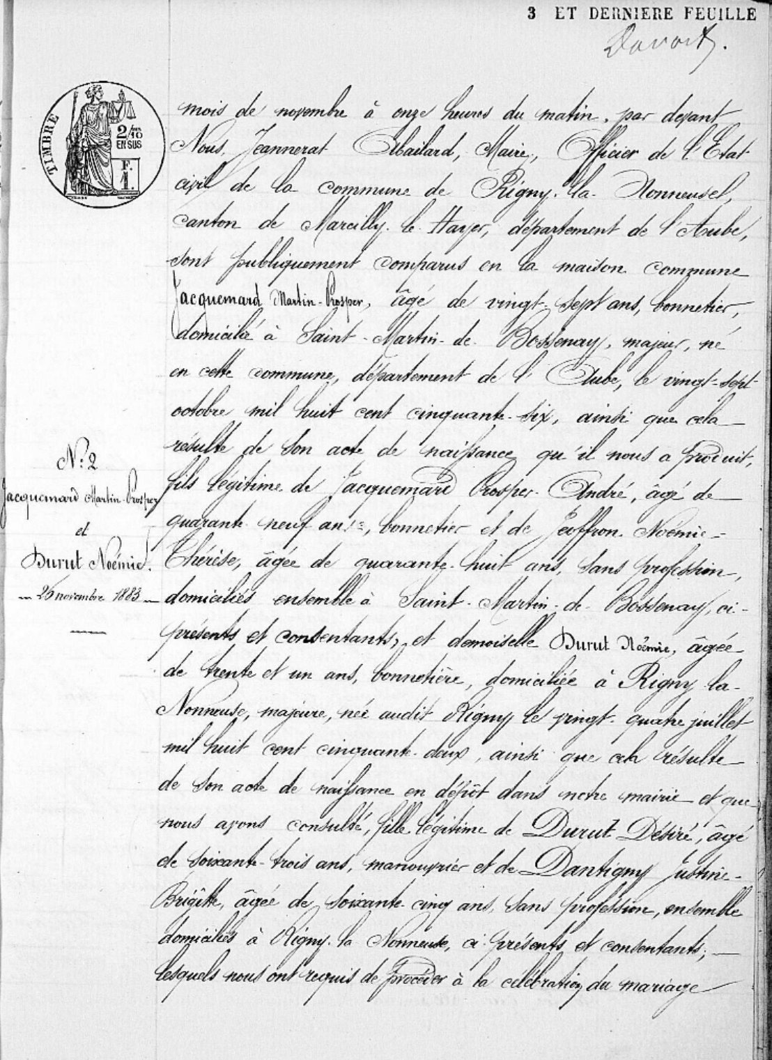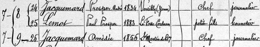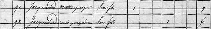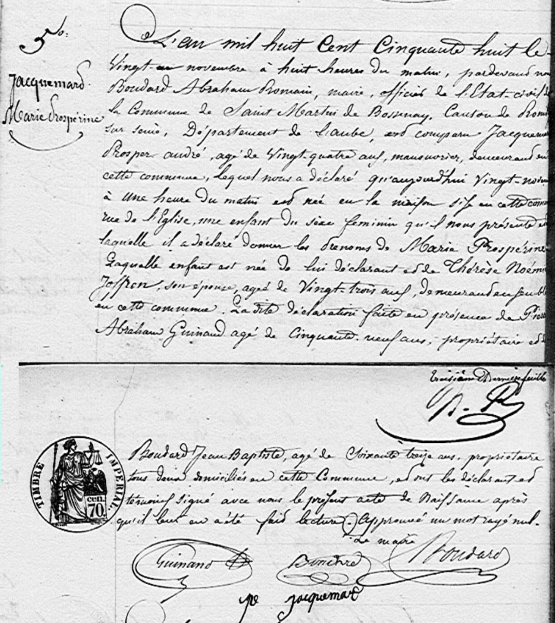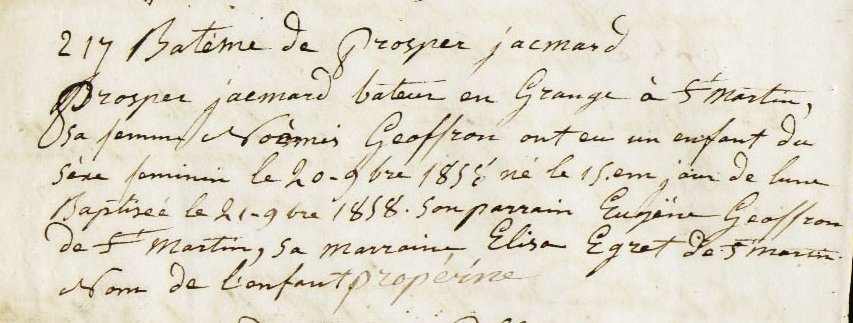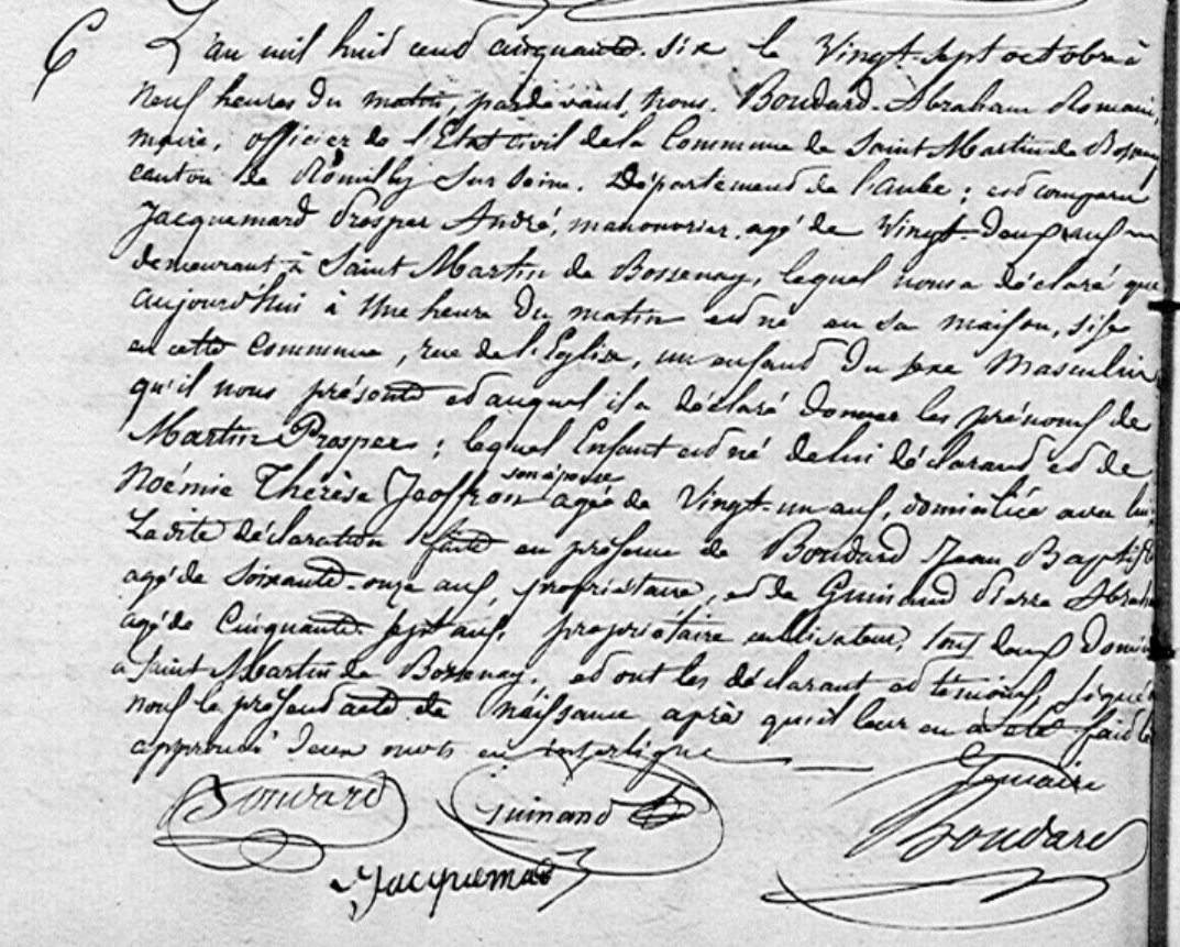 acte de naissance du fils de Martin Prosper dit Prosper Jacquemard et de Thérèse Noémie Joffron dite Noémie Joffron, l'enfant né le 27 octobre 1856 s'appelle Martin Prosper Jacquemard, exactement comme son père. Sur son