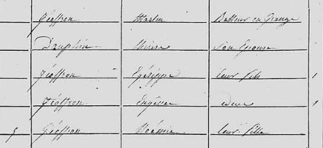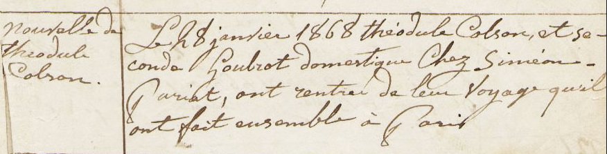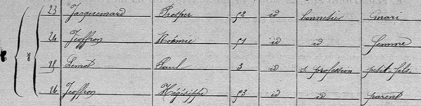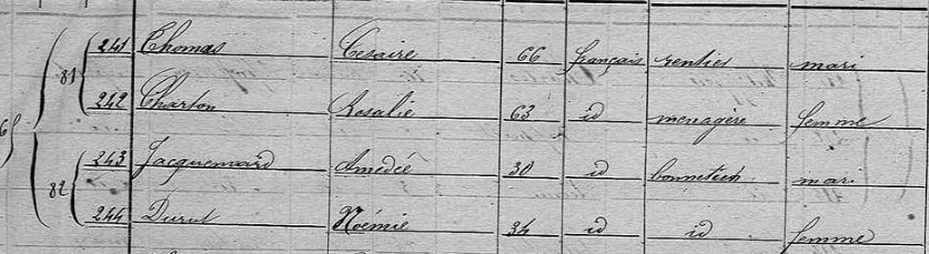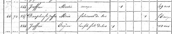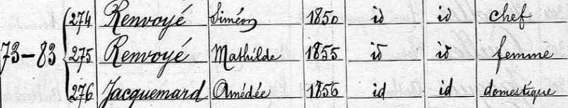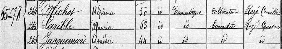 acte d'inhumation), est resté célibataire. Selon les années (voir les recensements), il a souvent vécu sous le même toit que ses parents Martin et Thérèse, ou que sa soeur Noémie et son beau-frère Prosper. En 1856, il est noté "regrattier" "Celui qui fait le commerce de produits de seconde main, en petite quantité ou des restes de restaurant ou de grandes maisons". En 1872, 1876, 1886, il est noté "sans profession".