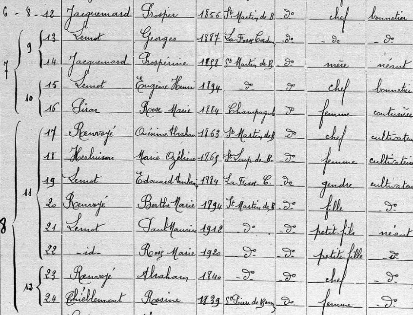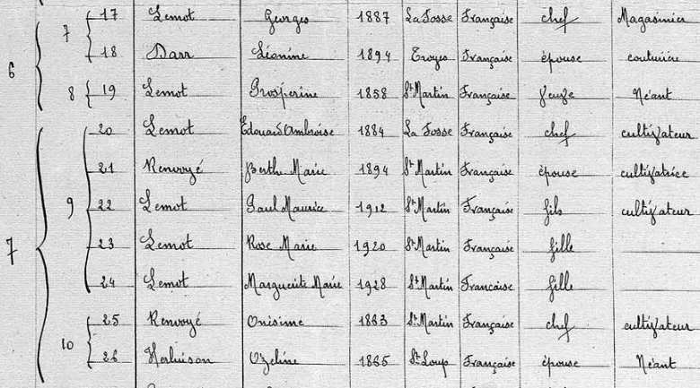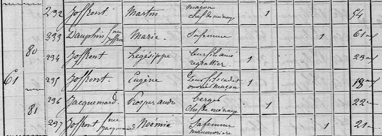 acte de naissance), décédé après 1901, maçon, marié avec Célina Bourgeois, sans lien familial avec Lucien Bourgeois. Ils sont sans enfant, Célina étant décédée à 26 ans en 1871 à St Martin. D'après les recensements, Eugène, célibataire, habite longtemps La Fosse comme maçon puis journalier.