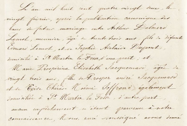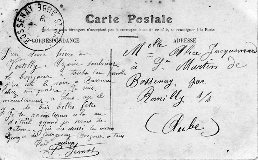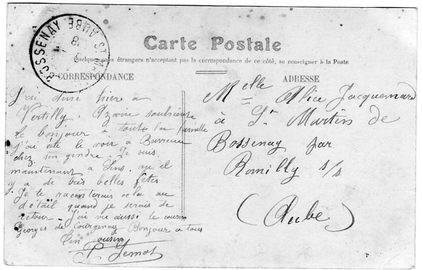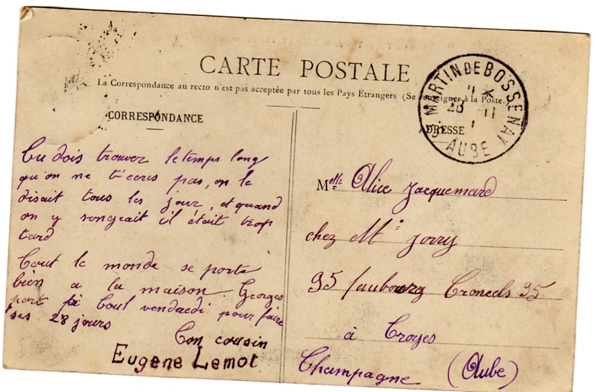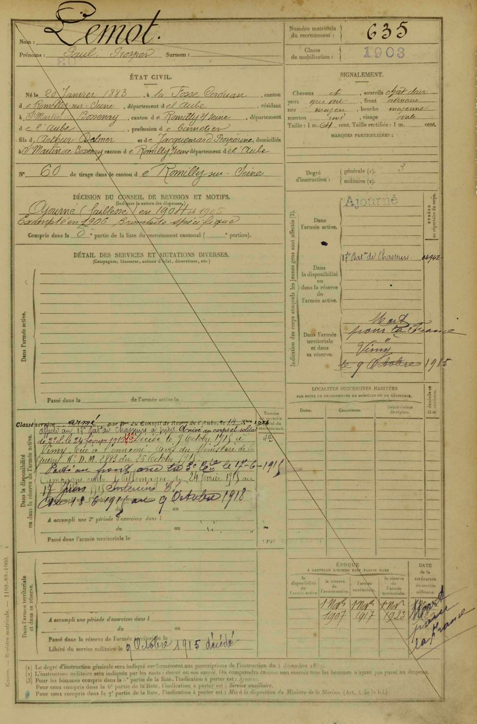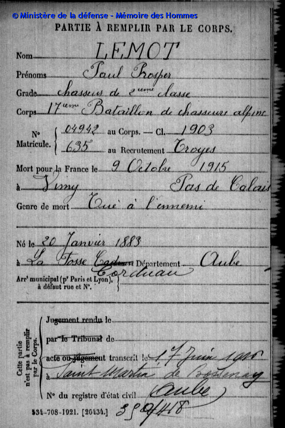 ici l'acte de naissance), à 2 km de Saint Martin de Bossenay. Ses parents Arthur Dalmer Lemot et Marie Prospérine Jacquemard s'étaient mariés onze mois plus tôt, le 20 février 1882 à Saint Martin de Bossenay. Paul a été baptisé à St Martin le 4 février 1883, son parrain étant son oncle Martin Prosper dit Amédée Jacquemard, sa marraine étant Esther Henriette Ployé (probable tante de Léopold) (