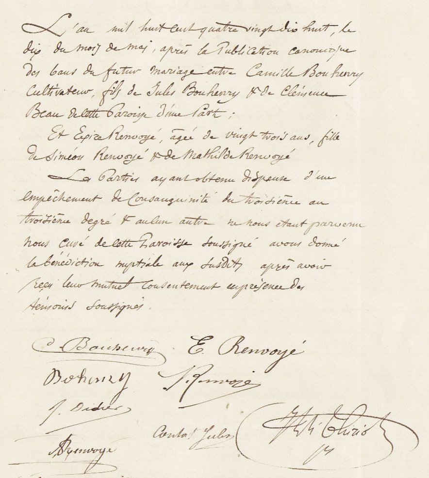 acte de baptème, le 20 avril 1884 à St Martin, indique que ses parrain et marraine sont Camille Bouhenry, le futur député-maire, et sa femme Exire Renvoyé. La page Wikipédia de Camille Bouhenry : "homme politique français né le 23 novembre 1873 à Saint-Martin-de-Bossenay (Aube) et décédé le 15 juillet 1942 à Saint-Martin-de-Bossenay. Agriculteur, il est investi dans diverses organisations agricoles et est vice-président de la Chambre d'agriculture. Maire de Saint-Martin-de-Bossenay en 1904, il est député de l'Aube de 1927 à 1932, inscrit au groupe des Républicains de gauche." +