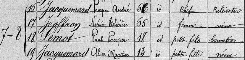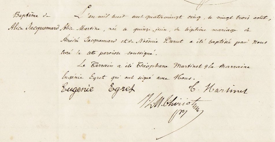 acte de baptème, du 4 septembre 1887 à St Martin indique pour marraine Berthe Chapelle, cousine issue de germain d'Alice du côté Durut, avec pour arrière grands parents communs Abdon Dantigny et Marie Catherine Charpentrat. Deux ans plus tard, en 1889, Berthe Chapelle, née en 1872, s'est mariée à St Lupien avec Eugène Romain. Comme indiqué précédemment, dès l'âge de deux ans, Alice est élevée par ses grands-parents paternels Prosper Jacquemard et Noémie Joffron, avec son cousin Paul Lemot sénior, de 4 ans son aîné.