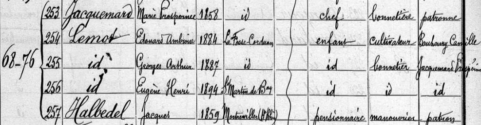 acte), son parrain étant Clémentin Ployé, représenté par son frère Léopold. Comme expliqué précédemment, il est très probable que son père biologique soit Jacques Halbedel, né dans le Haut Rhin, qui durant l'absence d'Arthur et après son décès, habitait avec sa mère et ses frères Edouard et Georges, alors que l'aîné de la famille de quatre garçons, Paul sénior, vivait chez les grands-parents Jacquemard. On ne sait pas si Eugène a appris l'identité de son père biologique.