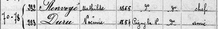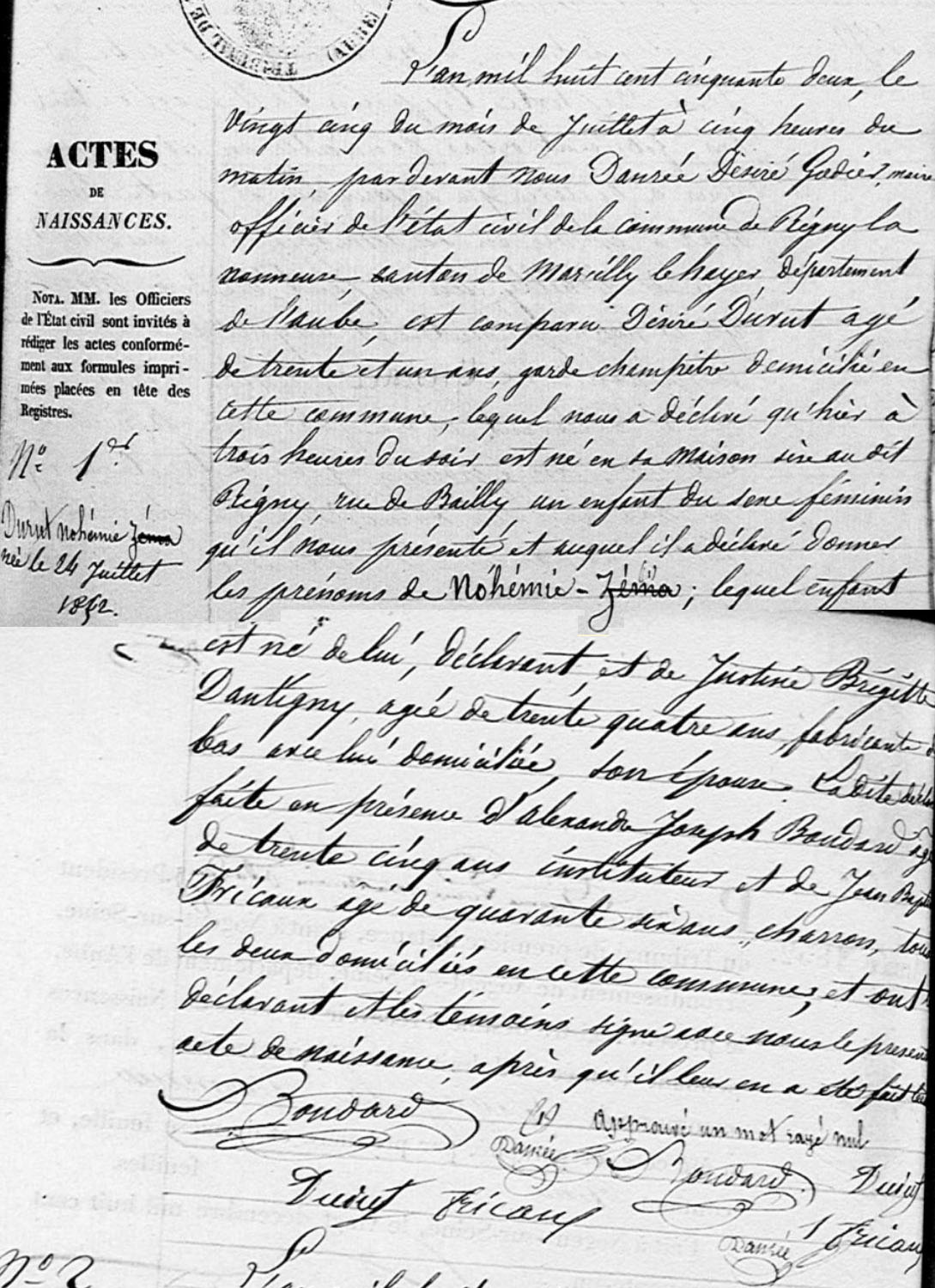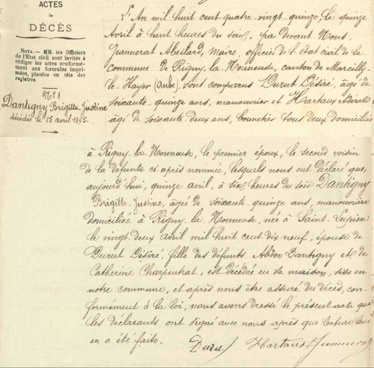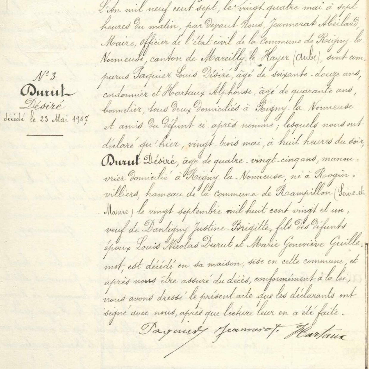 acte), Noémie Durut part seule s'installer chez son père, Désiré Durut à Rigny la Nonneuse et ce, jusqu'à la mort de celui-ci en 1907 à 85 ans (