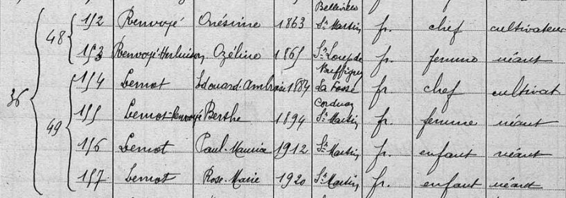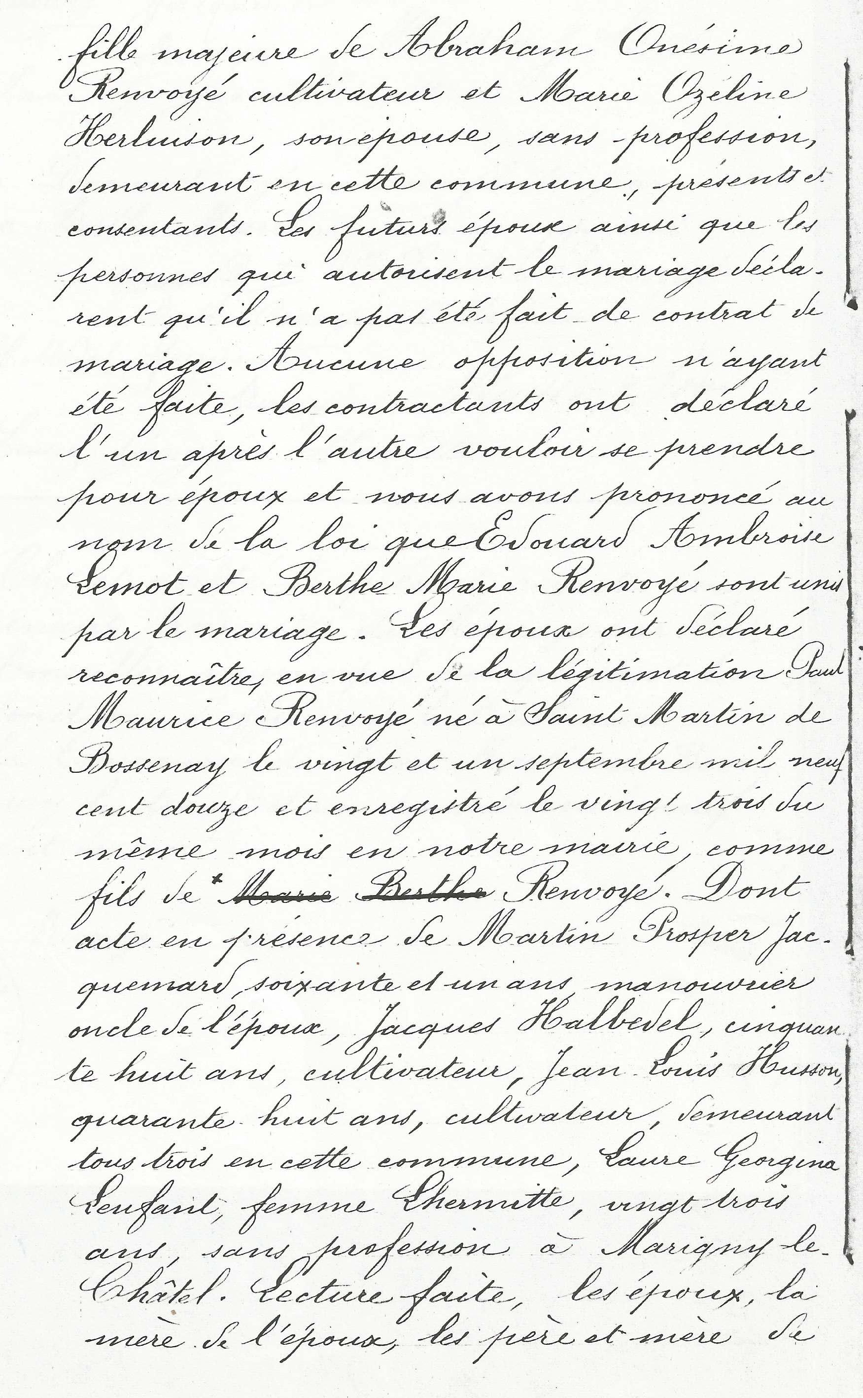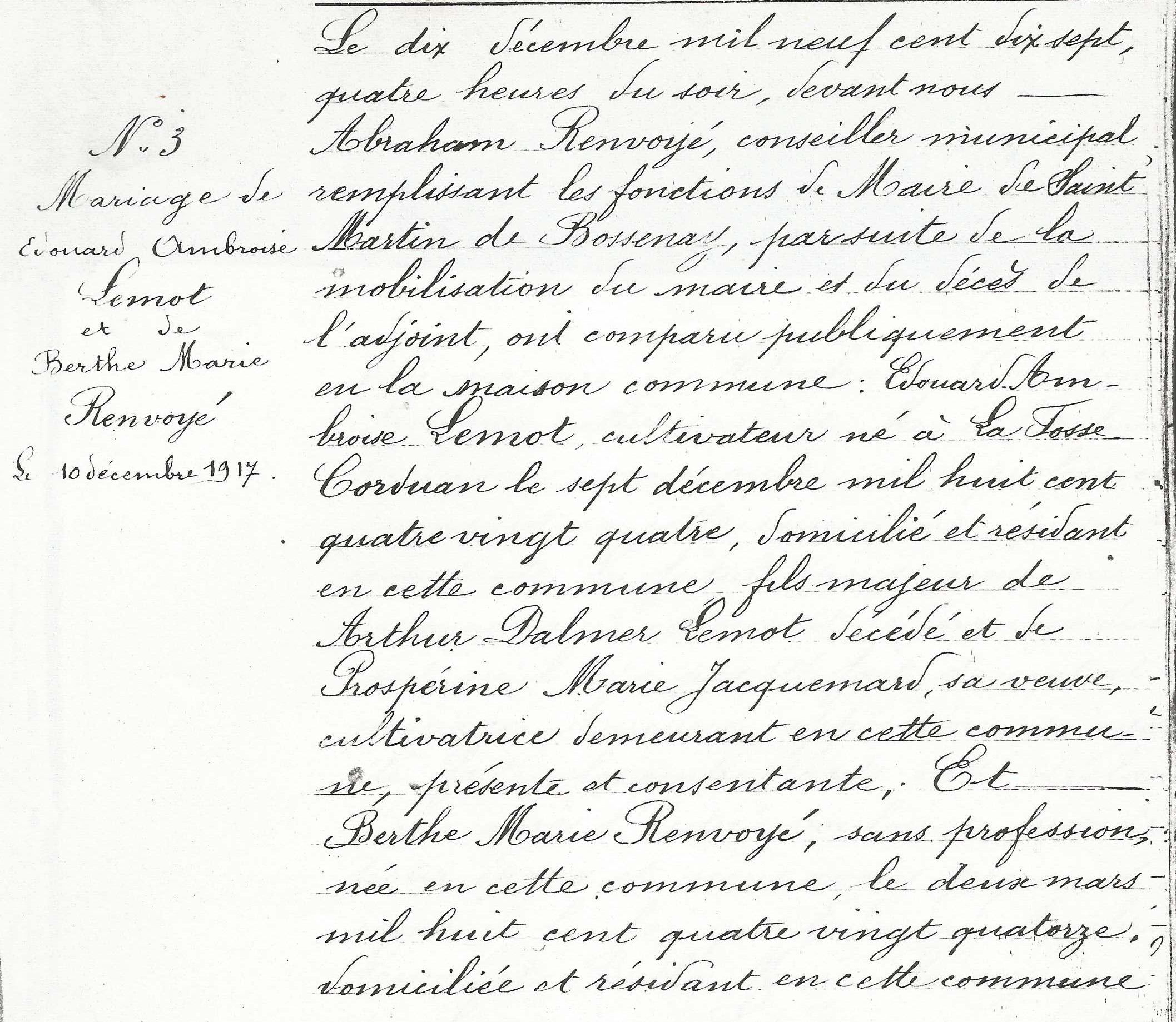 3). Edouard a alors 33 ans, Berthe 23 ans, née le 2 mars 1894 à Saint Martin de Bossenay, fille d'Abraham Onésime dit Onésime Renvoyé et Marie Ozéline dite Ozéline Herluison vivant à St Martin (
