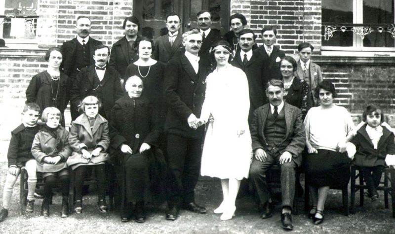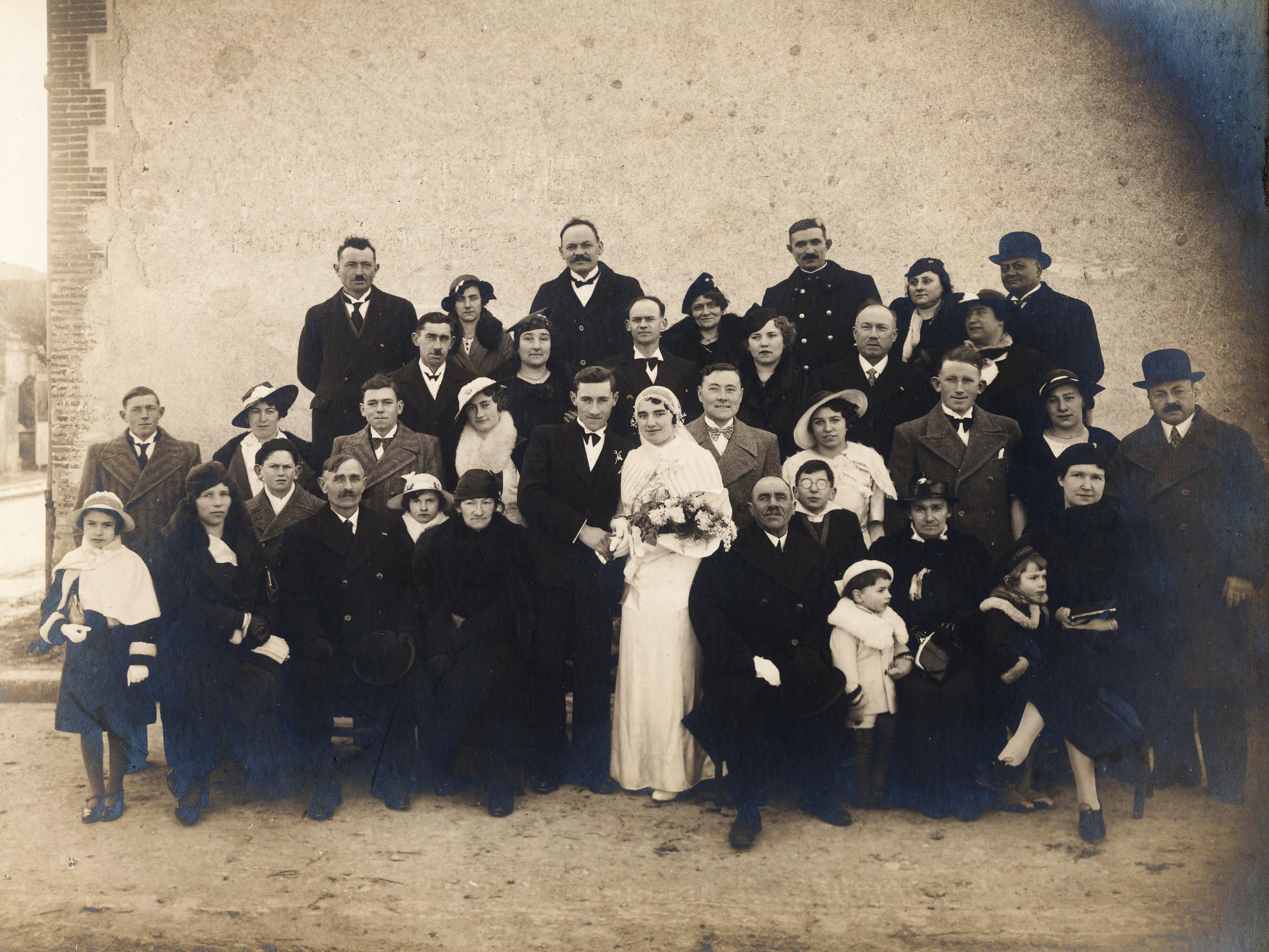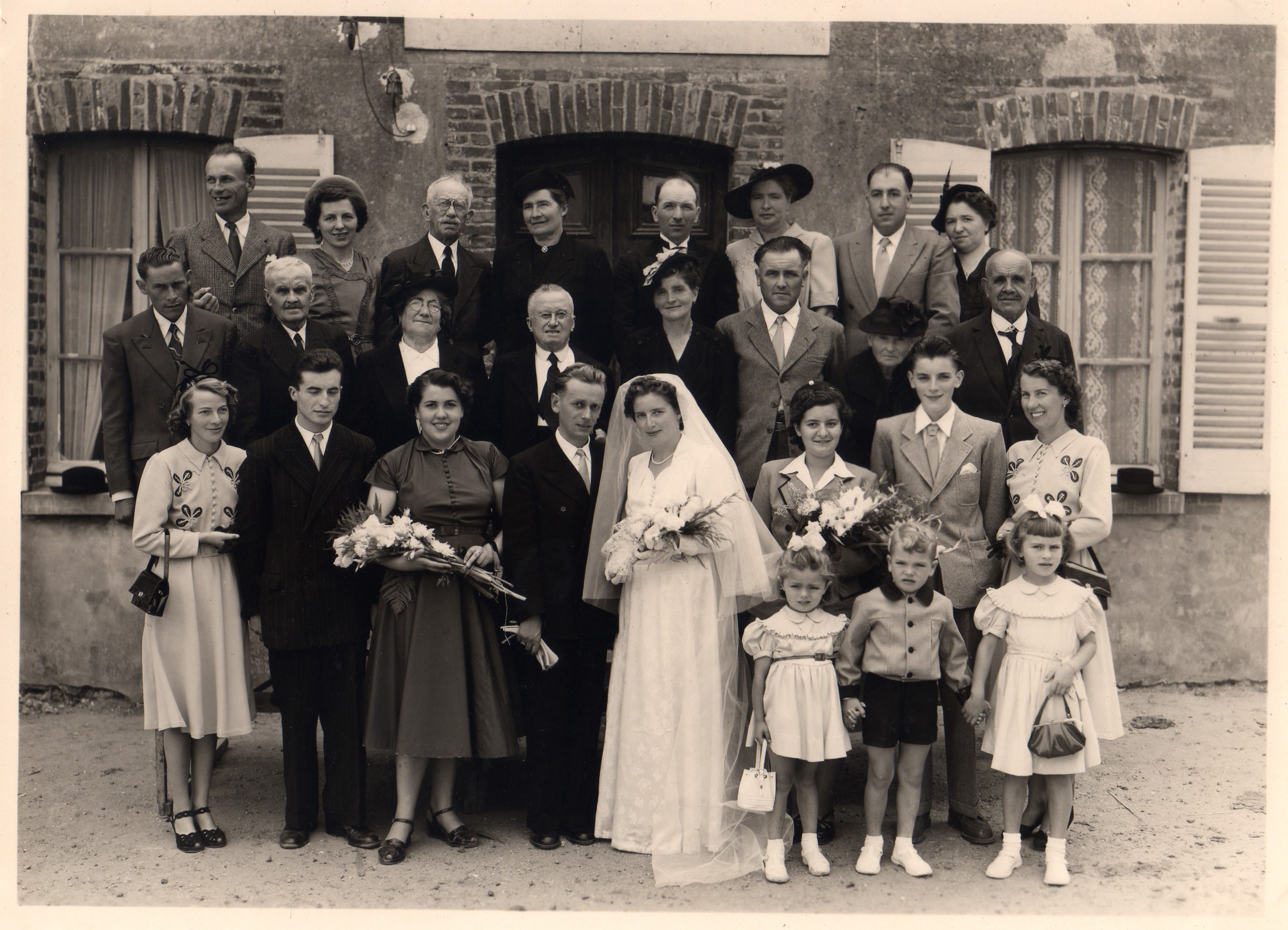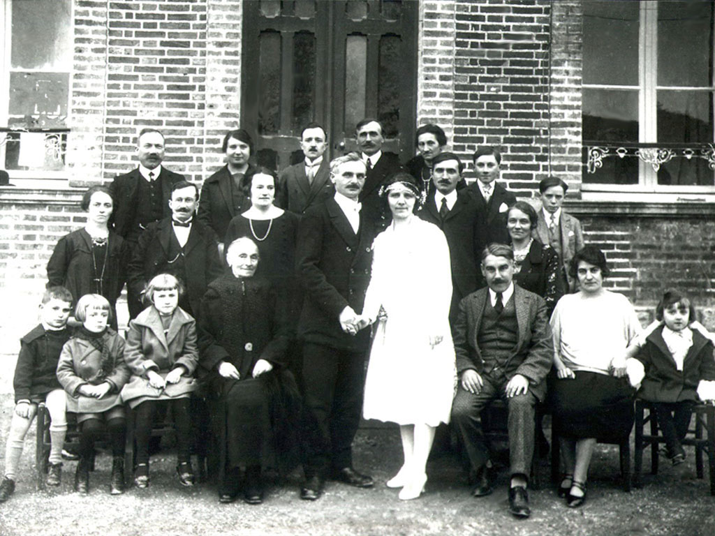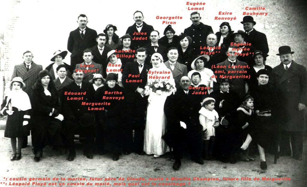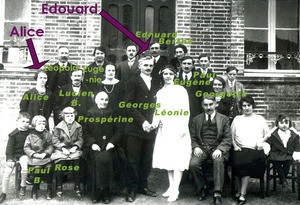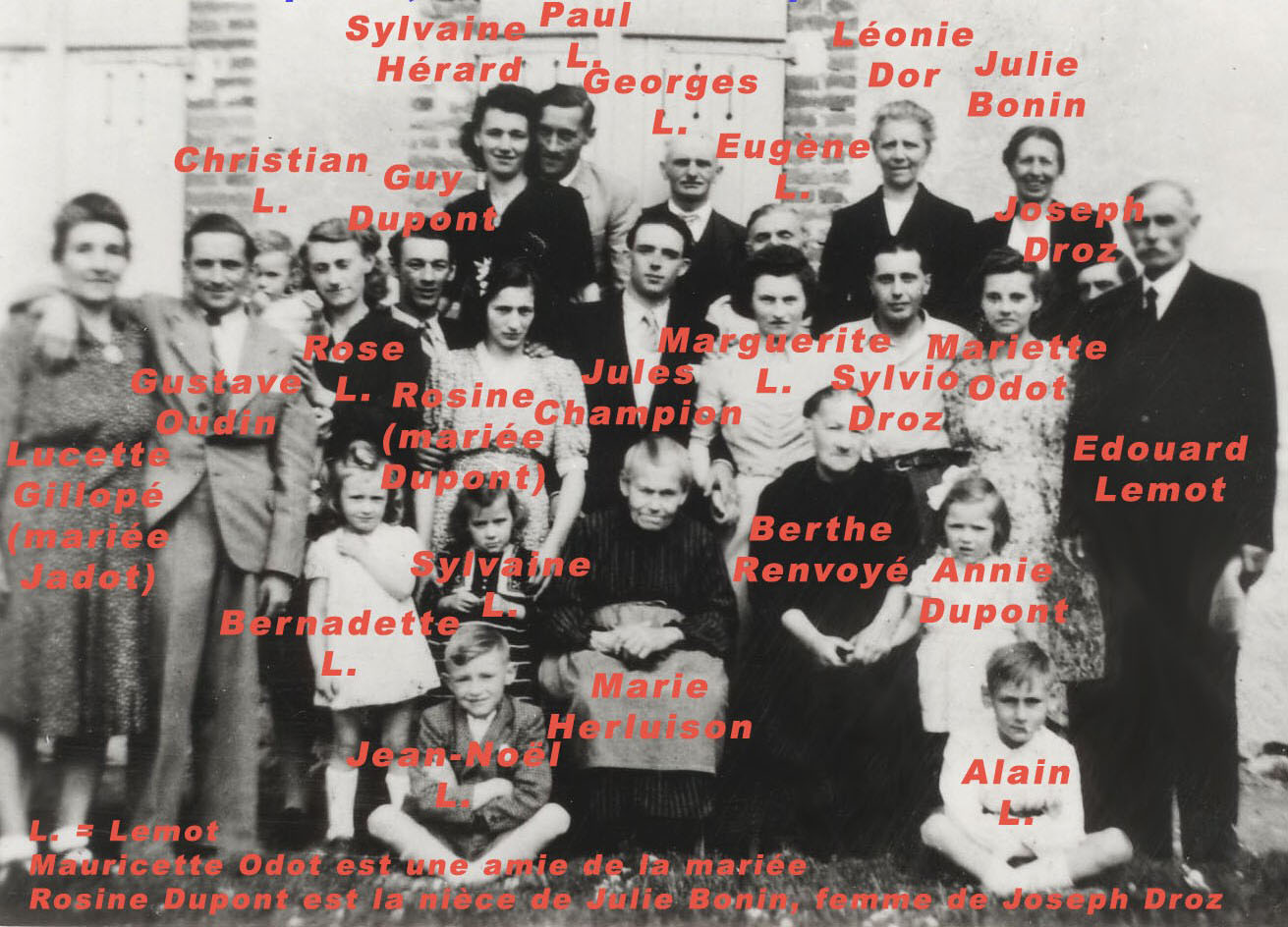 Le 26 octobre 1927, à Saint Martin de Bossenay. Debout derrière : Léopold Ployé (cousin Jacquemard issu de germain d'Alice et Edouard), son épouse Eugénie Gastinel, X, Edouard (43 ans) et Berthe (33 ans), leur fils Paul Lemot (15 ans). Debout devant : Alice (40 ans) et Lucien (47 ans), x, les mariés (40 et 33 ans), Eugène (33 ans) et Georgette (43 ans), X. Assis : X, Paul Bourgeois (5 ans), fils d'Alice, Rose Lemot (7 ans), fille d'Edouard, Prospérine (69 ans), mère d'Alice et Edouard, X, X, X. (les X sont probablement de la famille de la mariée). Des cinq petits-enfants de Prosper et Noémie, il ne manque que Paul sénior, décédé à la guerre de1914-1918. Leur fille Prospérine est là, leur fils Amédée est absent (pour une raison inconnue, il décède après 1930). |