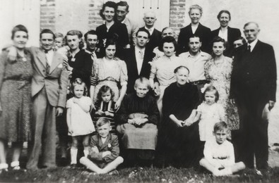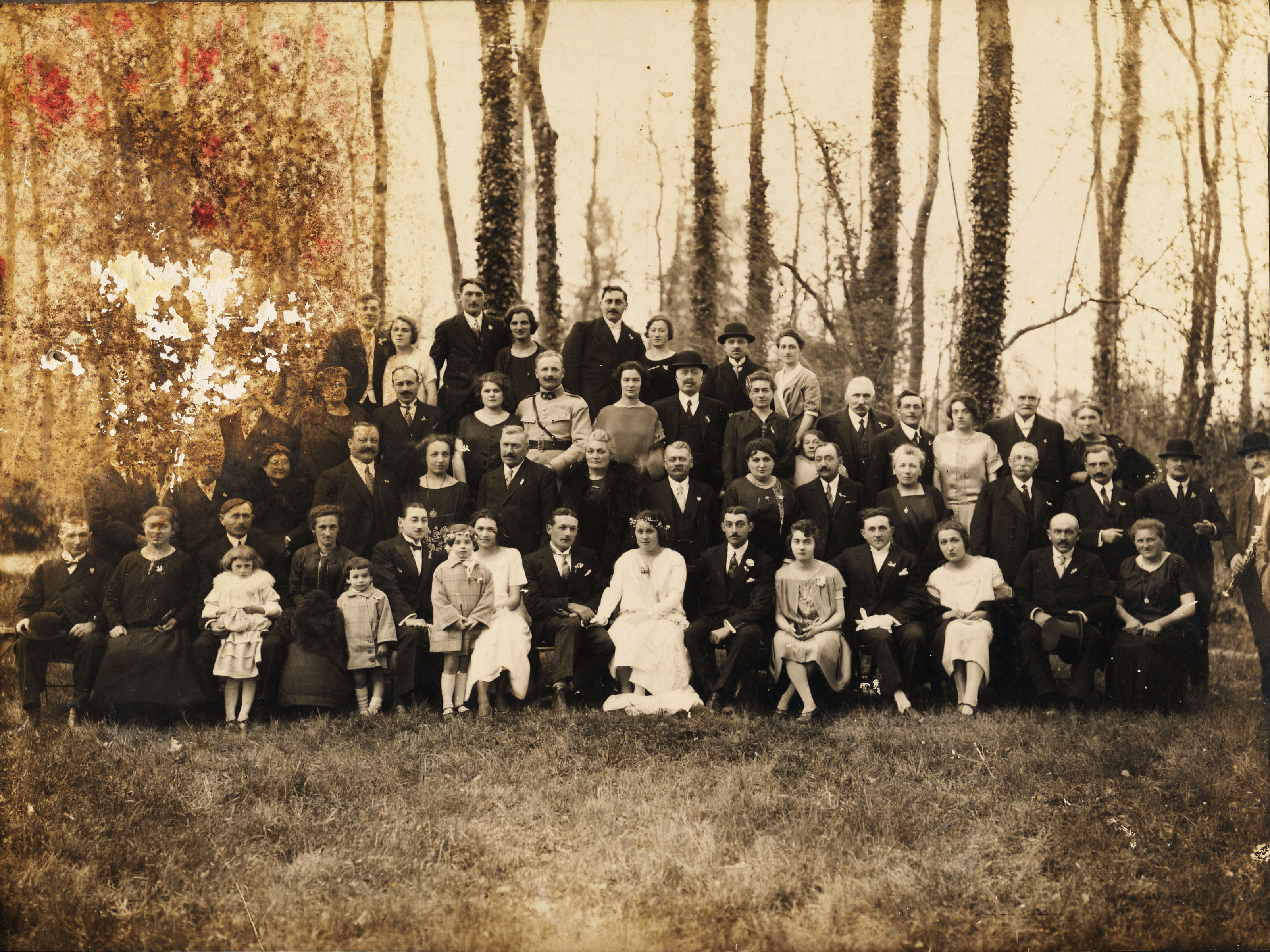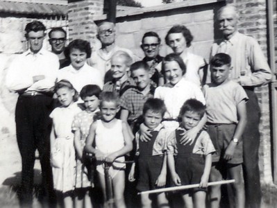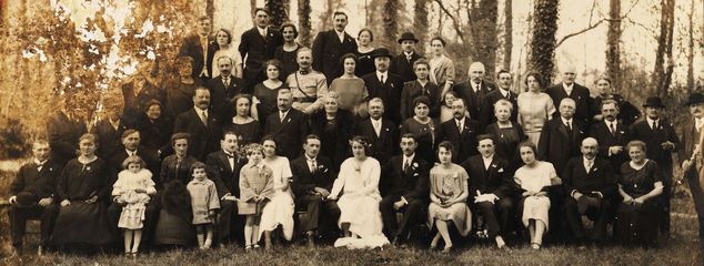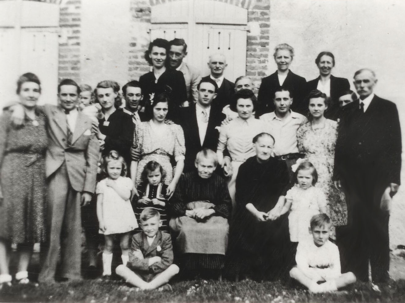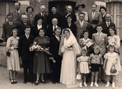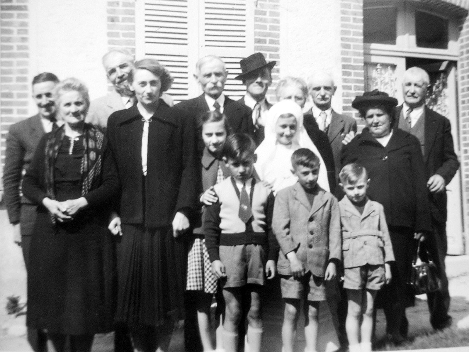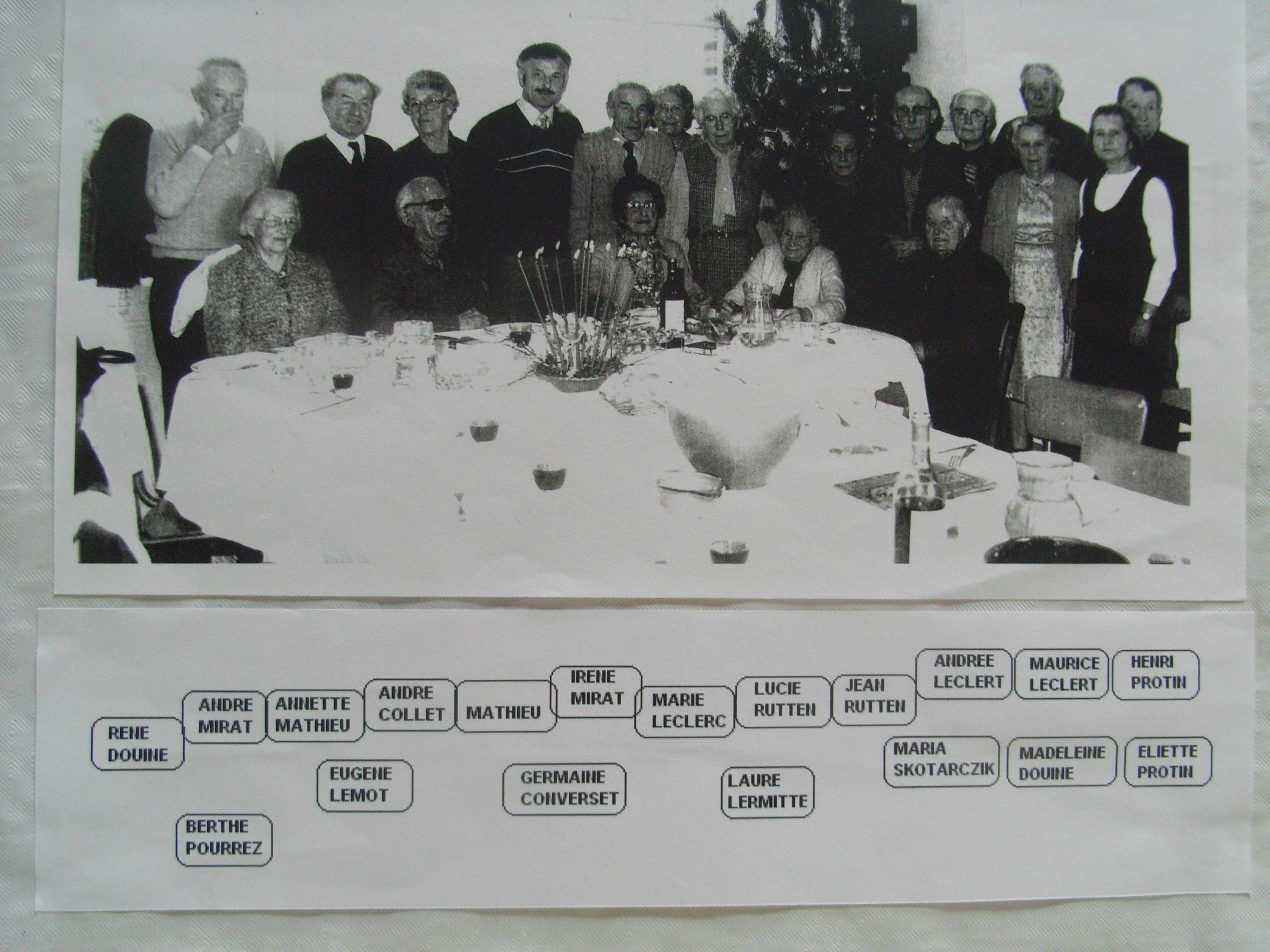 Le 26 octobre 1927, à Saint Martin de Bossenay. Debout derrière : Léopold Ployé (cousin Jacquemard issu de germain d'Alice et Edouard), son épouse Eugénie Gastinel, X, Edouard (43 ans) et Berthe (33 ans), leur fils Paul Lemot (15 ans). Debout devant : Alice (40 ans) et Lucien (47 ans), x, les mariés (40 et 33 ans), Eugène (33 ans) et Georgette (43 ans), X. Assis : X, Paul Bourgeois (5 ans), fils d'Alice, Rose Lemot (7 ans), fille d'Edouard, Prospérine (69 ans), mère d'Alice et Edouard, X, X, X. (les X sont probablement de la famille de la mariée). Des cinq petits-enfants de Prosper et Noémie, il ne manque que Paul sénior, décédé à la guerre de1914-1918. Leur fille Prospérine est là, leur fils Amédée est absent (pour une raison inconnue, il décède après 1930). |