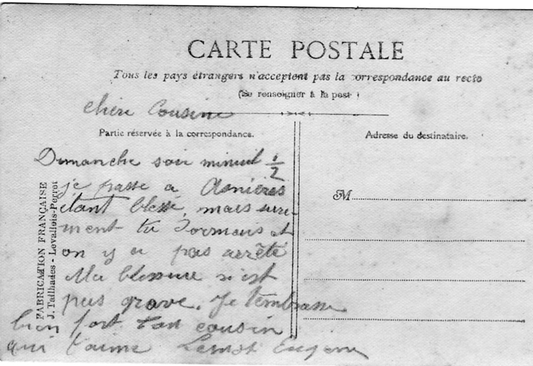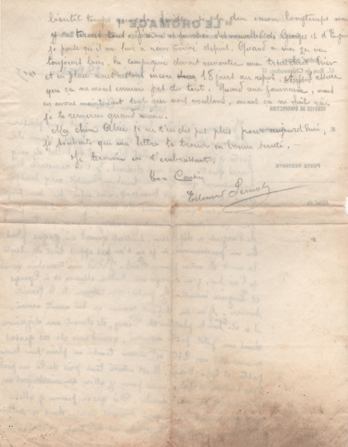 Ma chère Alice, J'ai reçu ta lettre hier, ça m'a fait bien plaisir d'avoir de tes nouvelles et en même temps, comme de juste, j'ai eu le bel oeillet blanc et le billet de cinq francs que tu avais mis dedans. Je t'en remercie bien, heureusement que l'on va toucher bientôt cinq sous par jour, ça ne sera pas beaucoup, mais enfin ce sera toujours mieux, car quinze mois de campagne à un sous par jour, ça n'était vraiment pas assez. L'on n'a pas toujours de l'argent à dépenser, surtout quand on gagne plus. Tu me pardonneras si je ne t'ai pas appris tout de suite la mort de notre pauvre Paul. J'étais aux tranchées quand je l'ai su, j'ai envoyé une lettre à Maman et à Georges et Eugène ensuite. Je pensais que maman te le ferait savoir. J'ai su depuis comme ça lui est arrivé, il a été tué sur le plateau de Vimy, ils étaient une dizaine dans un petit poste avancé, quand une de ces grosses marmites, un 210, est venu tomber en plein sur leur poste et les a broyés. Il est enterré tout près de là au pied d'un buisson d'épines, mais pour y aller en ce moment ce n'est pas facile. Dès qu'on pourra y aller assez facilement et si nous sommes encore dans le secteur, j'irai voir l'endroit. Tout cela est bien triste et il serait bientôt temps que cela finisse, si cela dure encore longtemps, nous y resterons tous. J'ai eu ce jourd'hui des nouvelles de Georges et d'Eugène, je pense qu'il ne leur est rien arrivé depuis. Quant à moi, ça va toujours bien, la compagnie devait remonter aux tranchées hier et en place nous restons encore 18 jours au repos, et je t'assure que ça ne nous ennuie pas du tout. Quant aux journaux, nous en avons maintenant tant que nous voulons, mais ça ne fait rien. Je te remercie quand même. Ma chère Alice, je ne t'en dis pas plus pour aujourd'hui, je souhaite que ma lettre te trouve en bonne santé. je termine en t'embrassant. Ton cousin. Edouard Lemot |