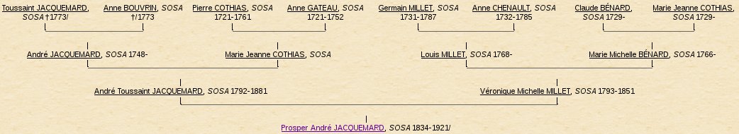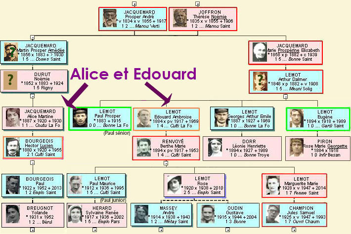 Pour trouver les origines géographiques des ascendants d'Alice et Edouard aux alentours de 1600, on se reportera aux lignes notées "Jacquemard" sur cette page des origines. Pour trouver les ascendants et cousins remarquables d'Alice et Edouard, on se reportera aux lignes notées en vert "Jacquemard" sur cette page des cousinages. Ce sont à la fois les ascendances de Prosper Jacquemard et Noémie Joffron.